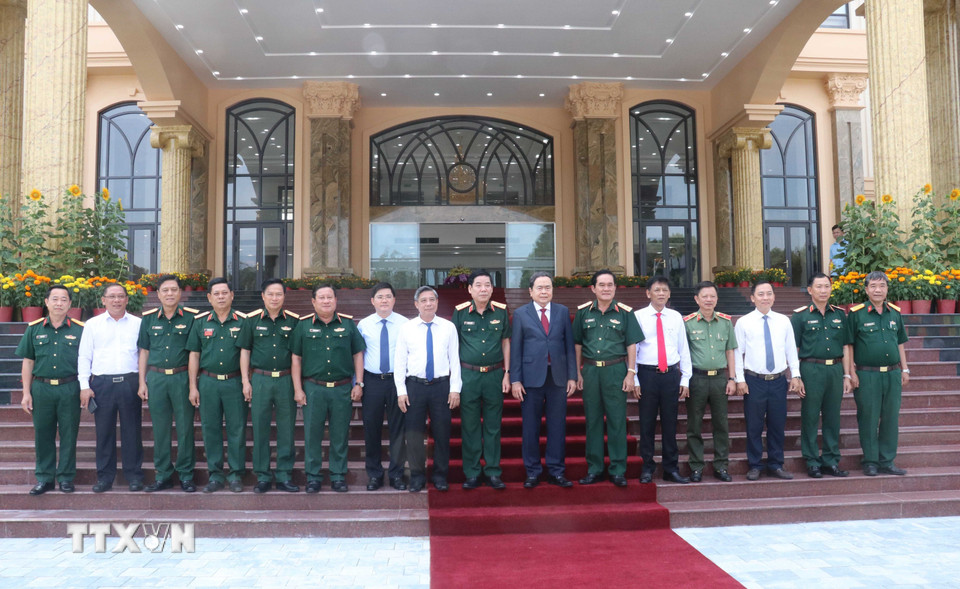 Chủ tịch Quốc hội Trần Thanh Mẫn cùng đoàn công tác chụp ảnh lưu niệm với lãnh đạo Bộ Tư lệnh Quân khu 9. (Ảnh: Ngọc Thiện/TTXVN)