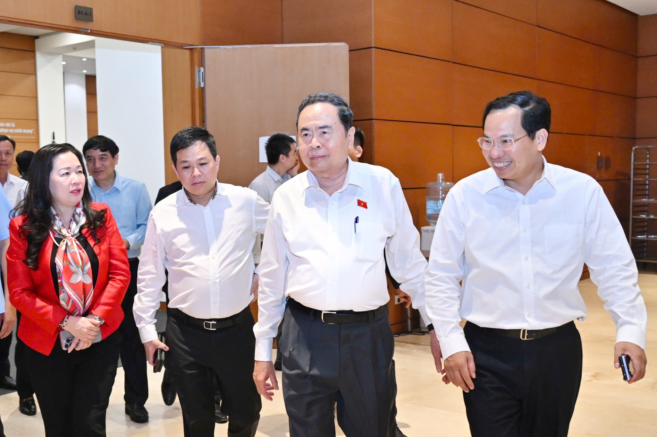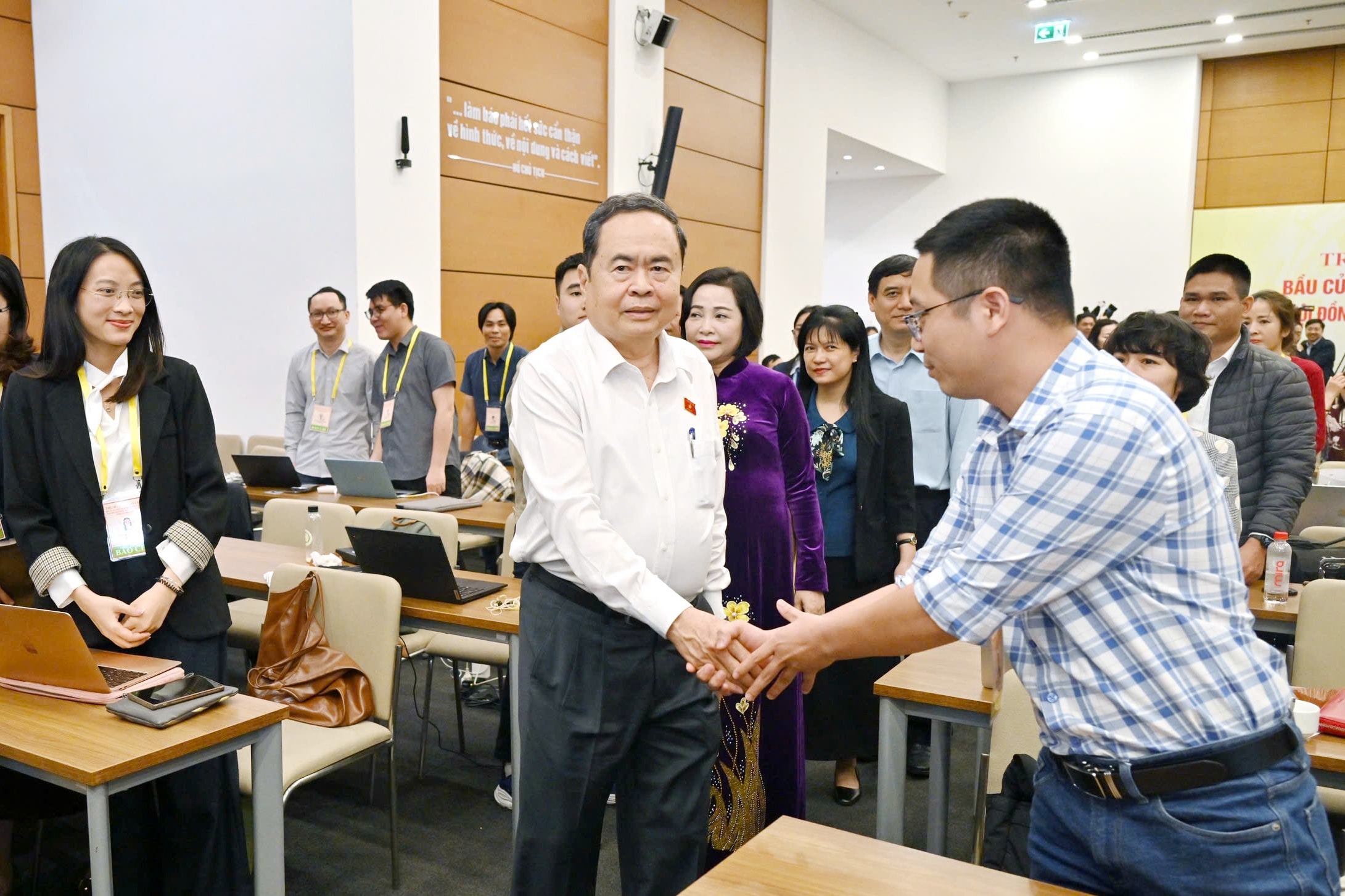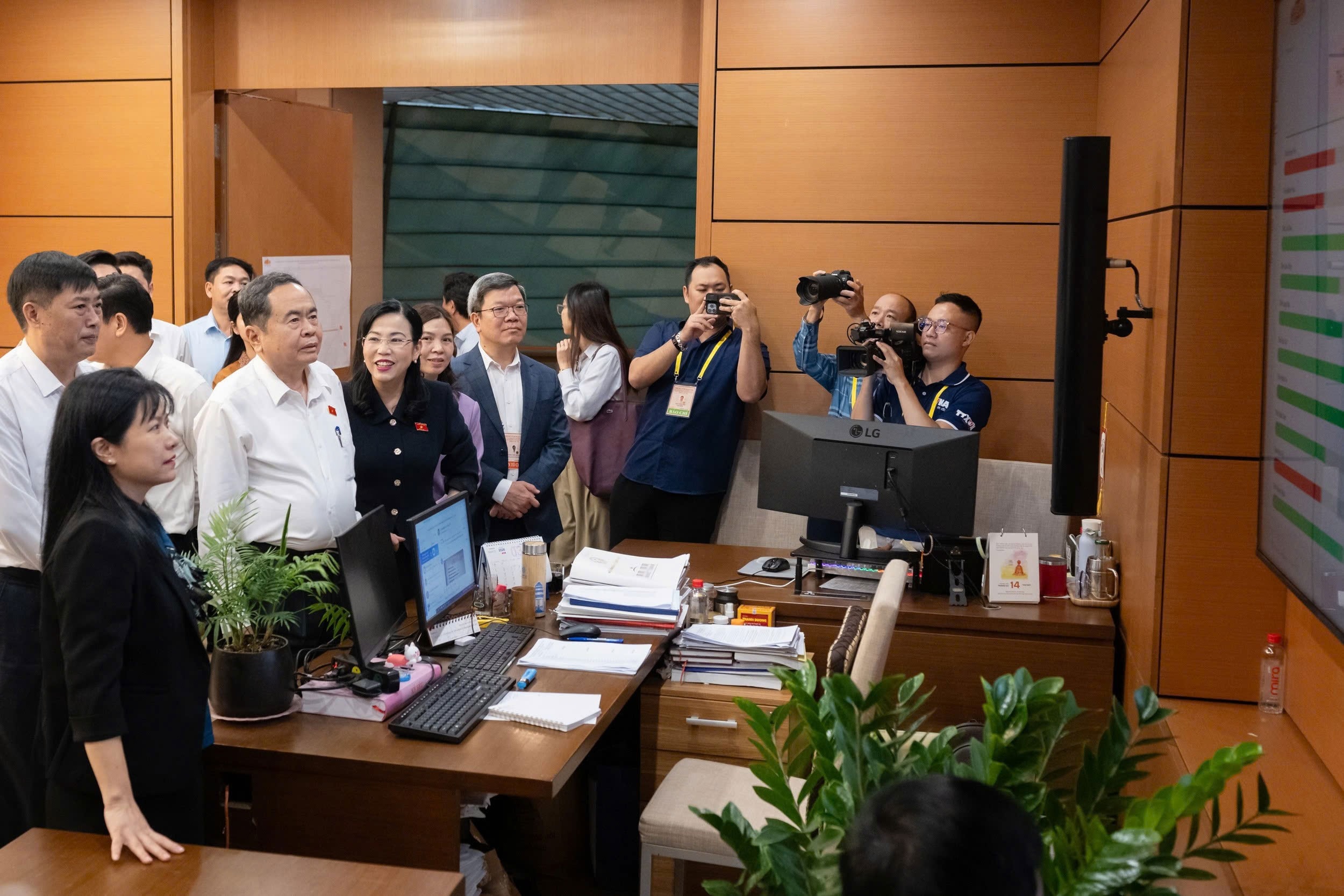 Chủ tịch Quốc hội Trần Thanh Mẫn thăm, động viên phóng viên báo chí tại Nhà Quốc hội. Ảnh: Quang Khánh