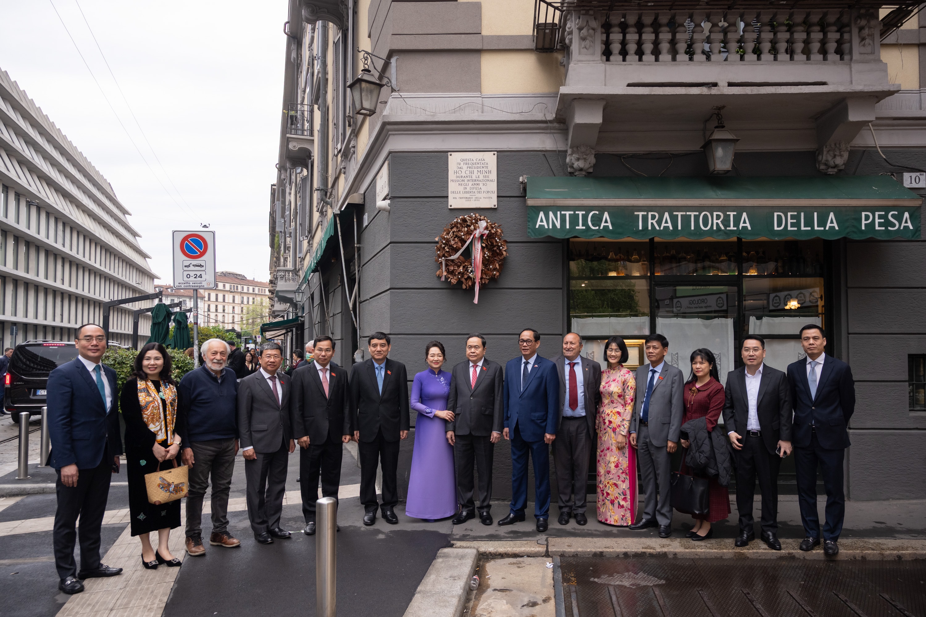 Đón Chủ tịch Quốc hội và Phu nhân cùng Đoàn tại quán Antica Trattoria della Pesa có Chủ tịch Hội Hữu nghị Italia - Việt Nam tại Milan Roberto Cocevari và đại diện Hội Hữu nghị Việt Nam - Italia, những người bạn thân thiết, luôn dành tình cảm đặc biệt cho Việt Nam.