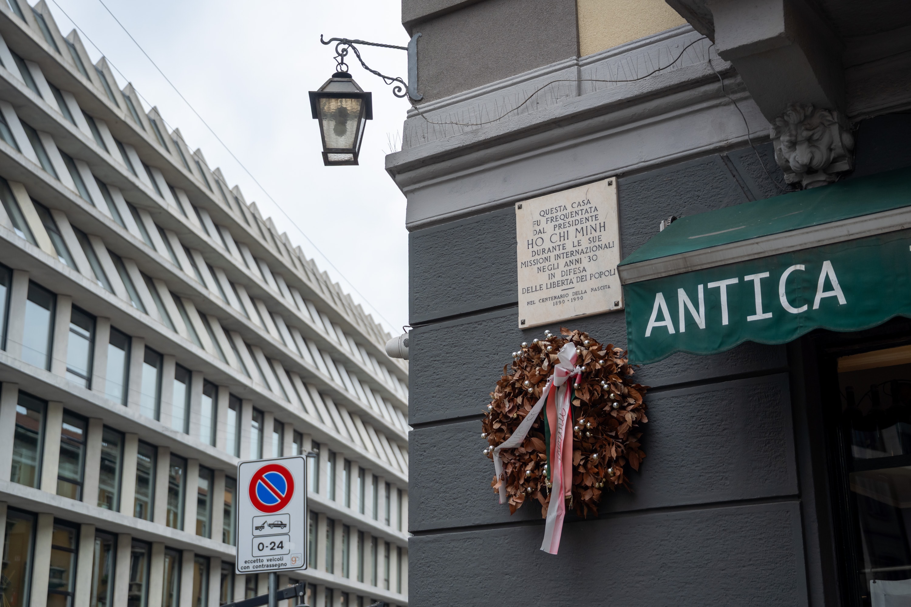 Bên ngoài nhà hàng là tấm bia đá màu trắng do chính quyền thành phố Milan gắn từ năm 1990, nhân dịp kỷ niệm 100 năm Ngày sinh Chủ tịch Hồ Chí Minh với dòng chữ khắc: “Ngôi nhà này là nơi Chủ tịch Hồ Chí Minh thường lui tới trong thời gian ở nước ngoài của Người vào những năm 1930 để bảo vệ tự do cho nhân dân”.