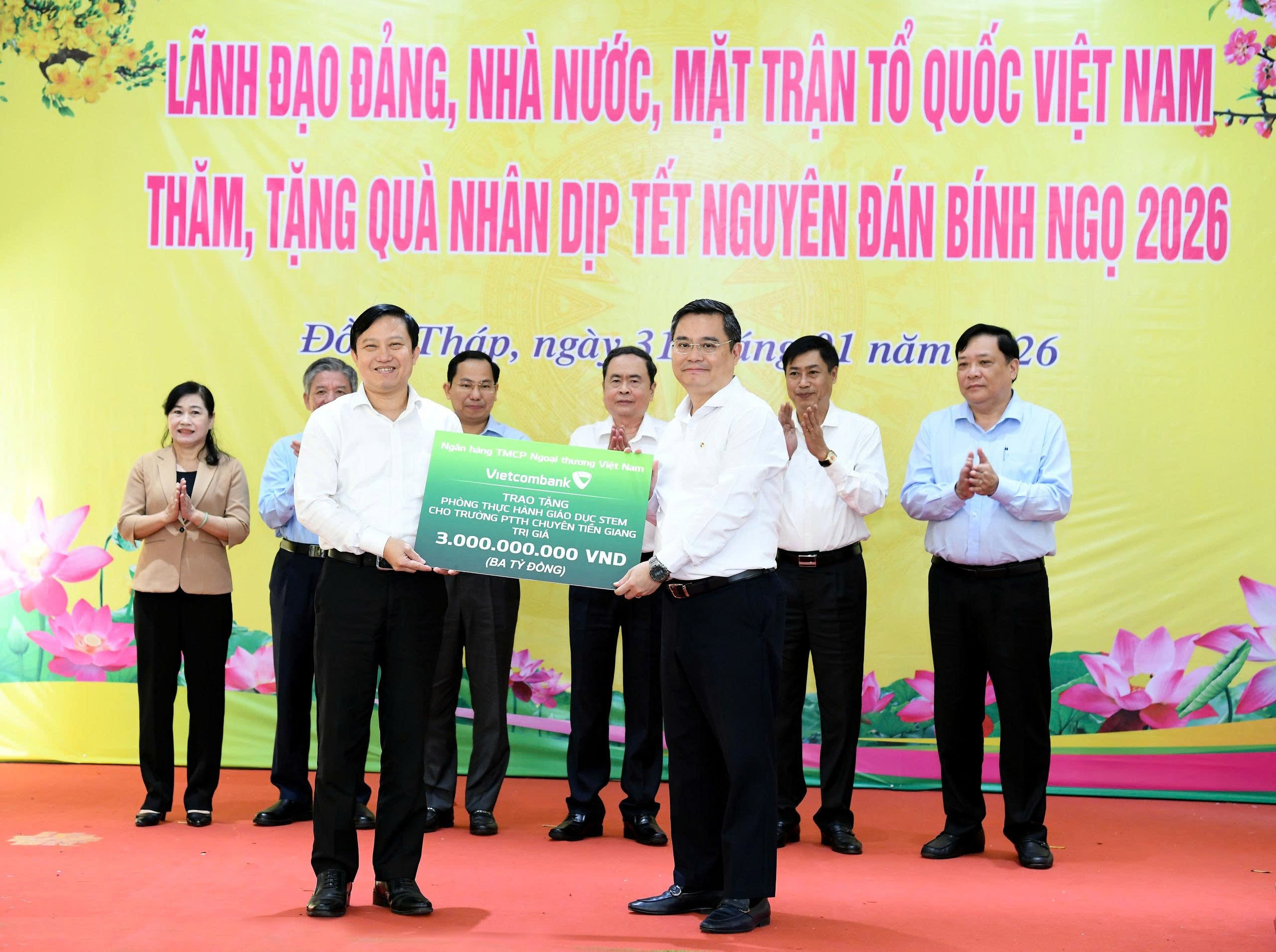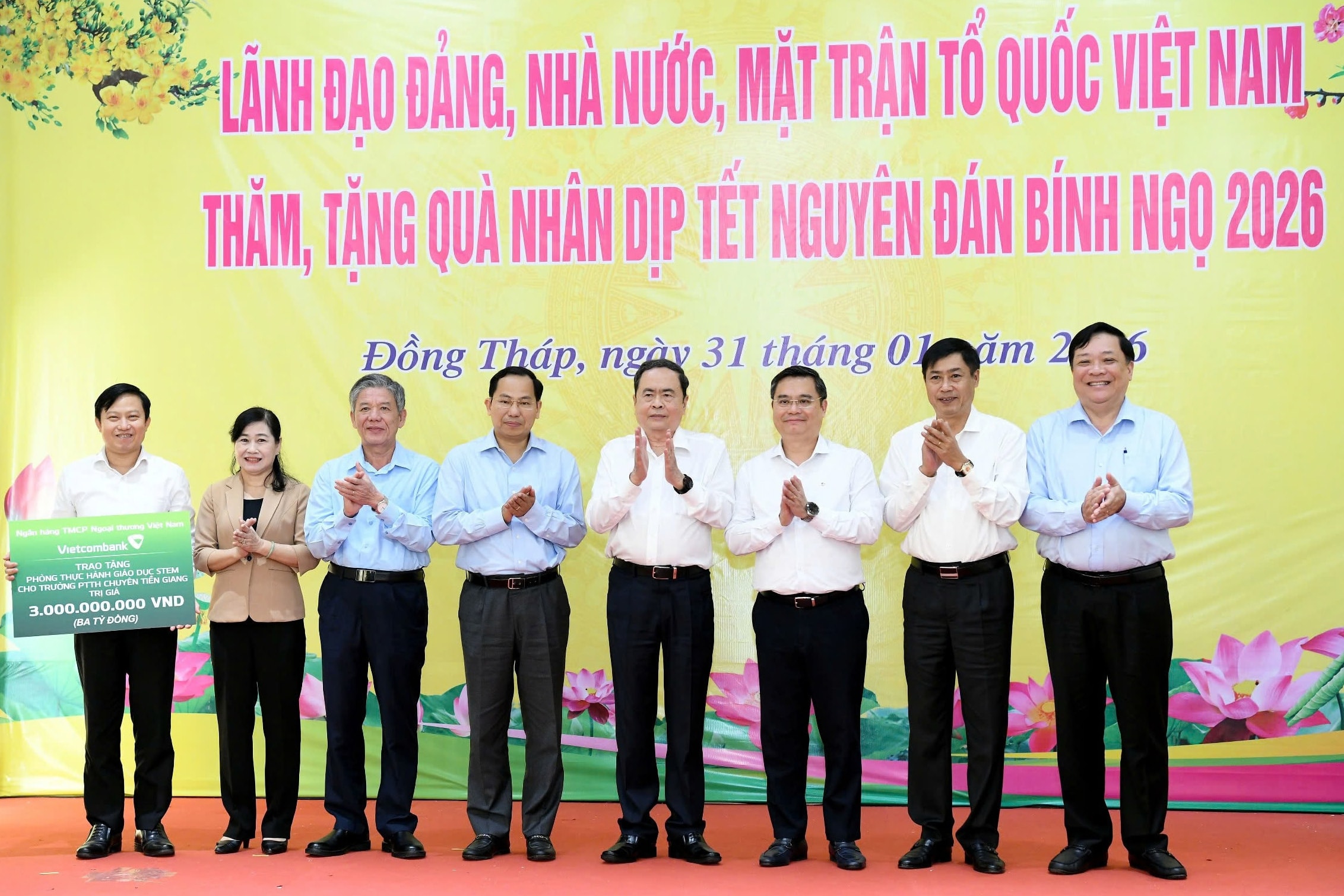 Chủ tịch Quốc hội Trần Thanh Mẫn và Đoàn công tác chứng kiến lãnh đạo Ngân hàng Thương mại cổ phần Ngoại thương Việt Nam (Vietcombank) trao biển tượng trưng hỗ trợ 3 tỷ đồng xây dựng phòng học STEM cho trường THPT chuyên Tiền Giang