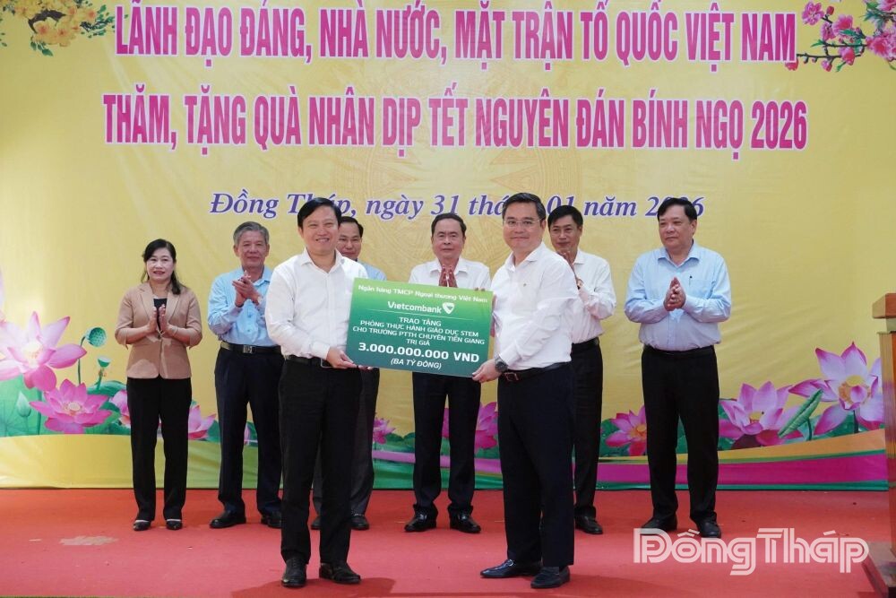 Chủ tịch Quốc hội Trần Thanh Mẫn và Đoàn công tác và lãnh đạo tỉnh Đồng Tháp chứng kiến lãnh đạo Ngân hàng Thương mại Cổ phần Ngoại thương Việt Nam (Vietcombank) trao biển tượng trưng hỗ trợ 3 tỷ đồng xây dựng phòng học STEM cho Trường Trung học phổ thông Chuyên Tiền Giang.