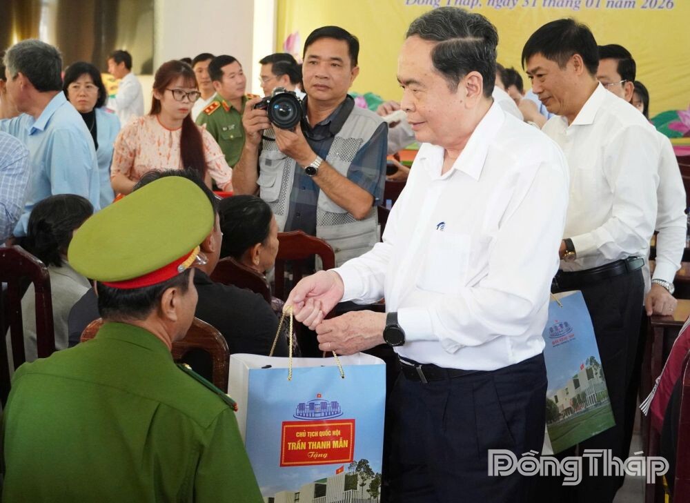 Chủ tịch Quốc hội Trần Thanh Mẫn tặng quà cho cán bộ, chiến sĩ lực lượng vũ trang.
