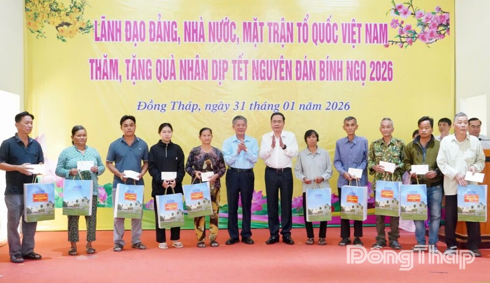 Chủ tịch Quốc hội Trần Thanh Mẫn (thứ 6 từ phải sang) và Bí thư Tỉnh ủy Đồng Tháp Ngô Chí Cường tặng quà tặng cho người dân có hoàn cảnh khó khăn trên địa bàn xã Ba Sao.
