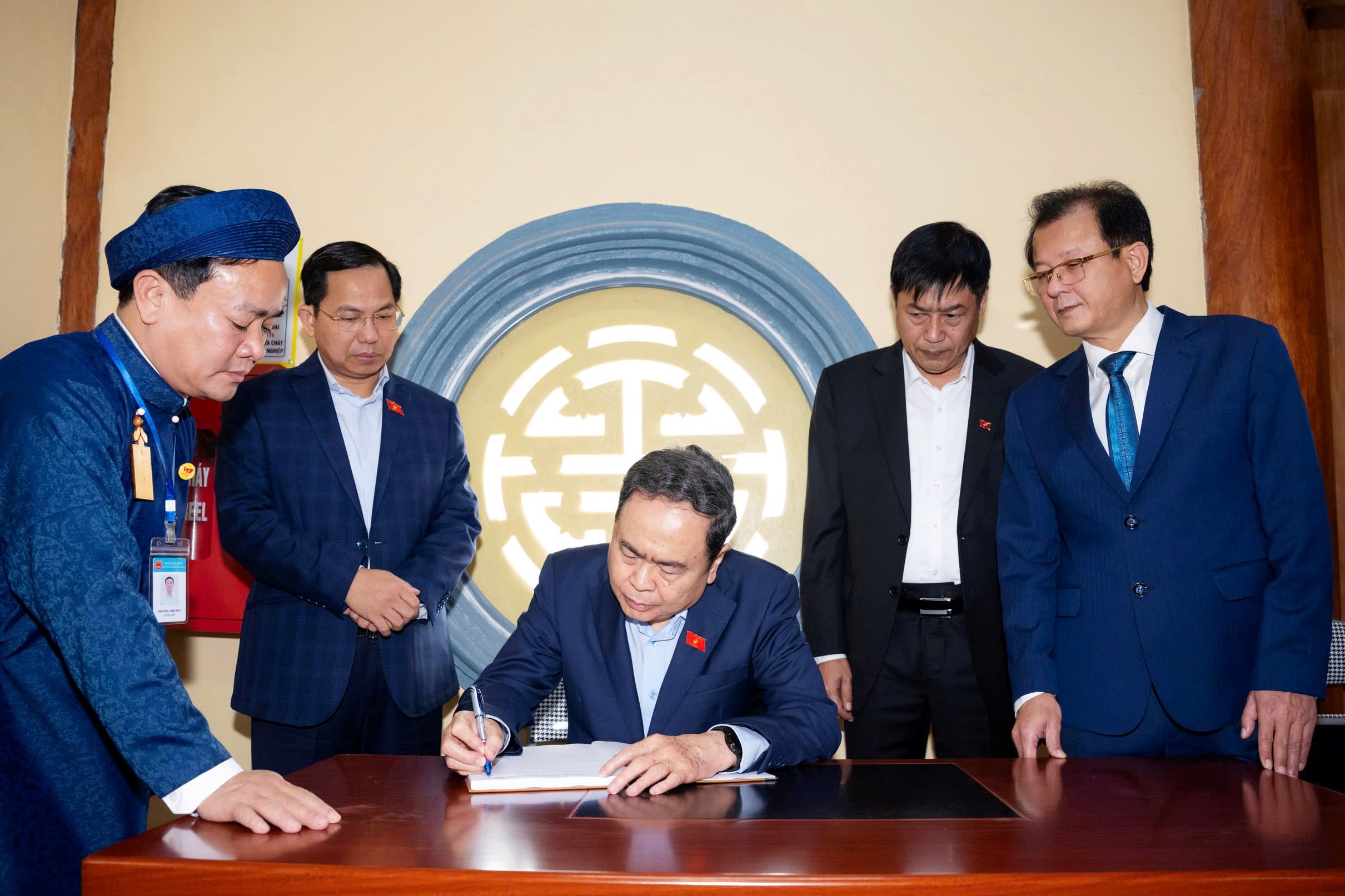 Chủ tịch Quốc hội Trần Thanh Mẫn ghi sổ lưu niệm tại Khu lưu niệm Trưởng ban Thường trực Quốc hội Bùi Bằng Đoàn. Ảnh: Lâm Hiển