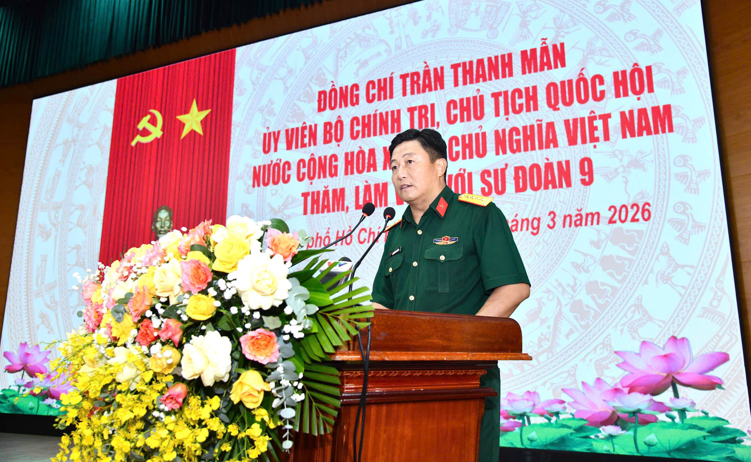 Phát biểu tại buổi làm việc, Chủ tịch Quốc hội Trần Thanh Mẫn bày tỏ vui mừng khi đến thăm Sư đoàn 9, đơn vị chủ lực có bề dày truyền thống anh hùng của Quân đội nhân dân Việt Nam.
