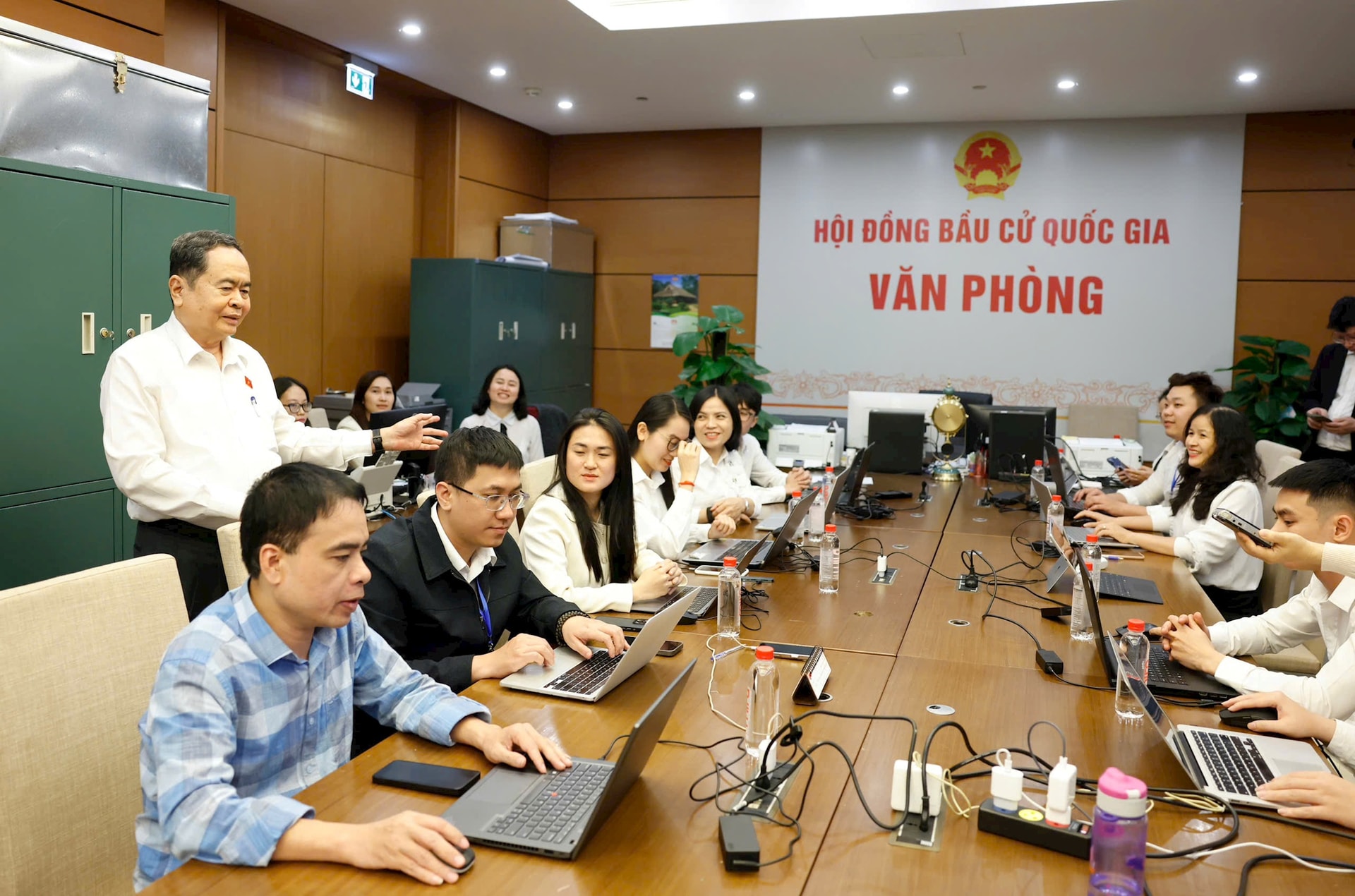 Chủ tịch Quốc hội Trần Thanh Mẫn kiểm tra tại Văn phòng Hội đồng Bầu cử quốc gia. Ảnh: Phạm Thắng