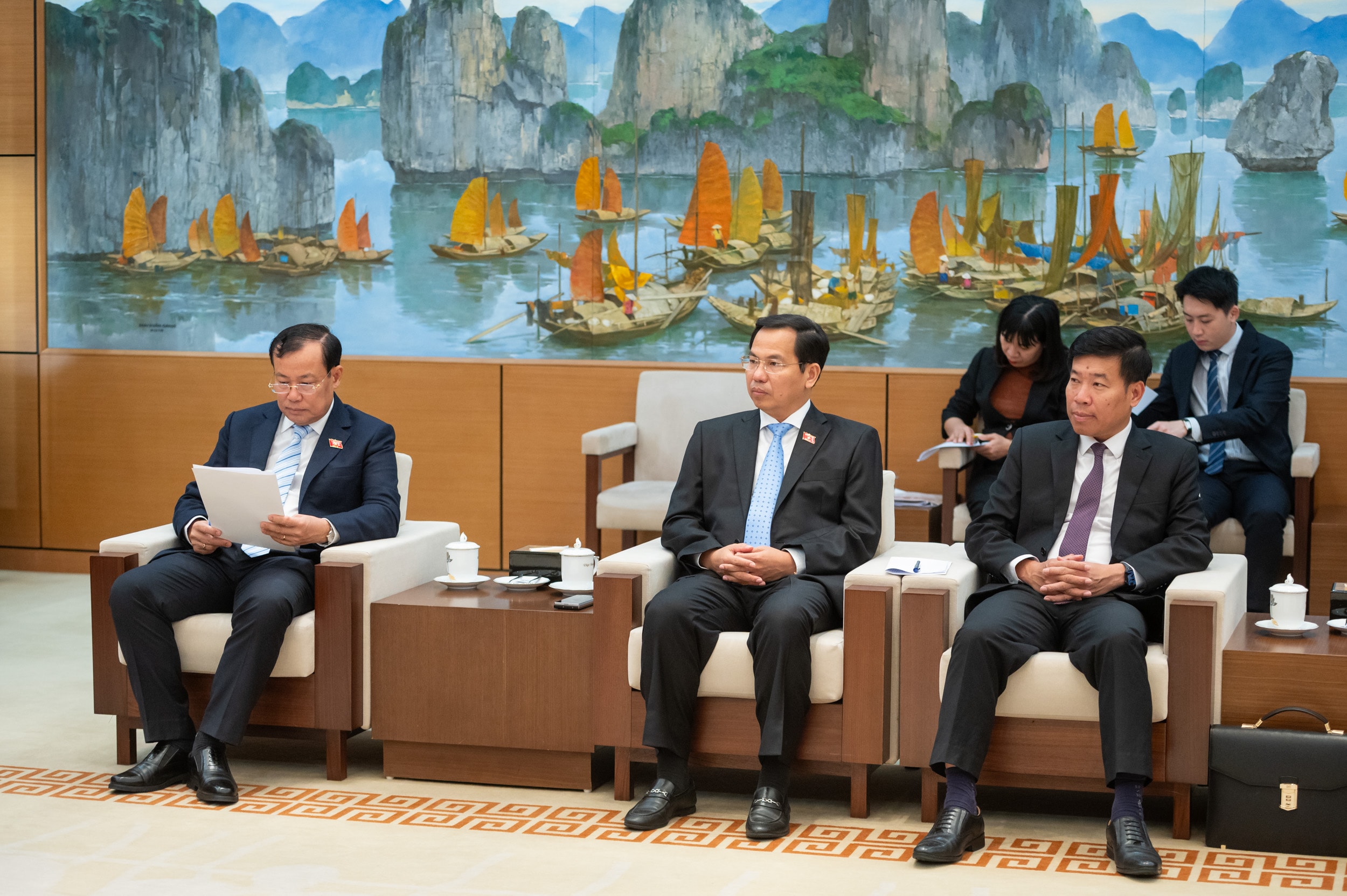 Chủ nhiệm Ủy ban Quốc phòng, An ninh và Đối ngoại, Thượng tướng Lê Tấn Tới; Tổng Thư ký Quốc hội, Chủ nhiệm Văn phòng Quốc hội Lê Quang Mạnh và Thứ trưởng Bộ Ngoại giao Nguyễn Mạnh Cường tham dự cuộc tiếp