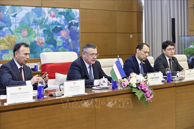 Chủ tịch Quốc hội Trần Thanh Mẫn và Chủ tịch Hạ viện Uzbekistan Nuriddin Ismoilov với đại biểu Uzbekistan. Ảnh: Doãn Tấn/TTXVN