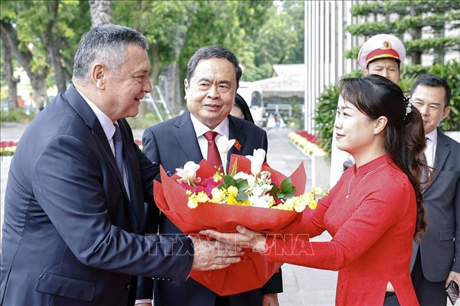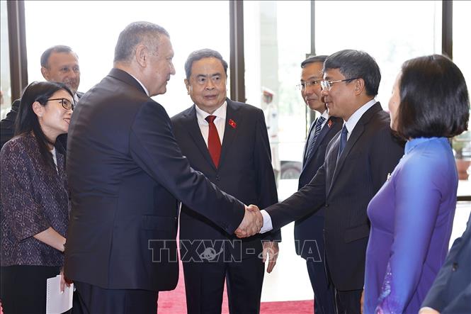 Chủ tịch Quốc hội Trần Thanh Mẫn đón Chủ tịch Hạ viện Uzbekistan Nuriddin Ismoilov. Ảnh: Doãn Tấn/TTXVN