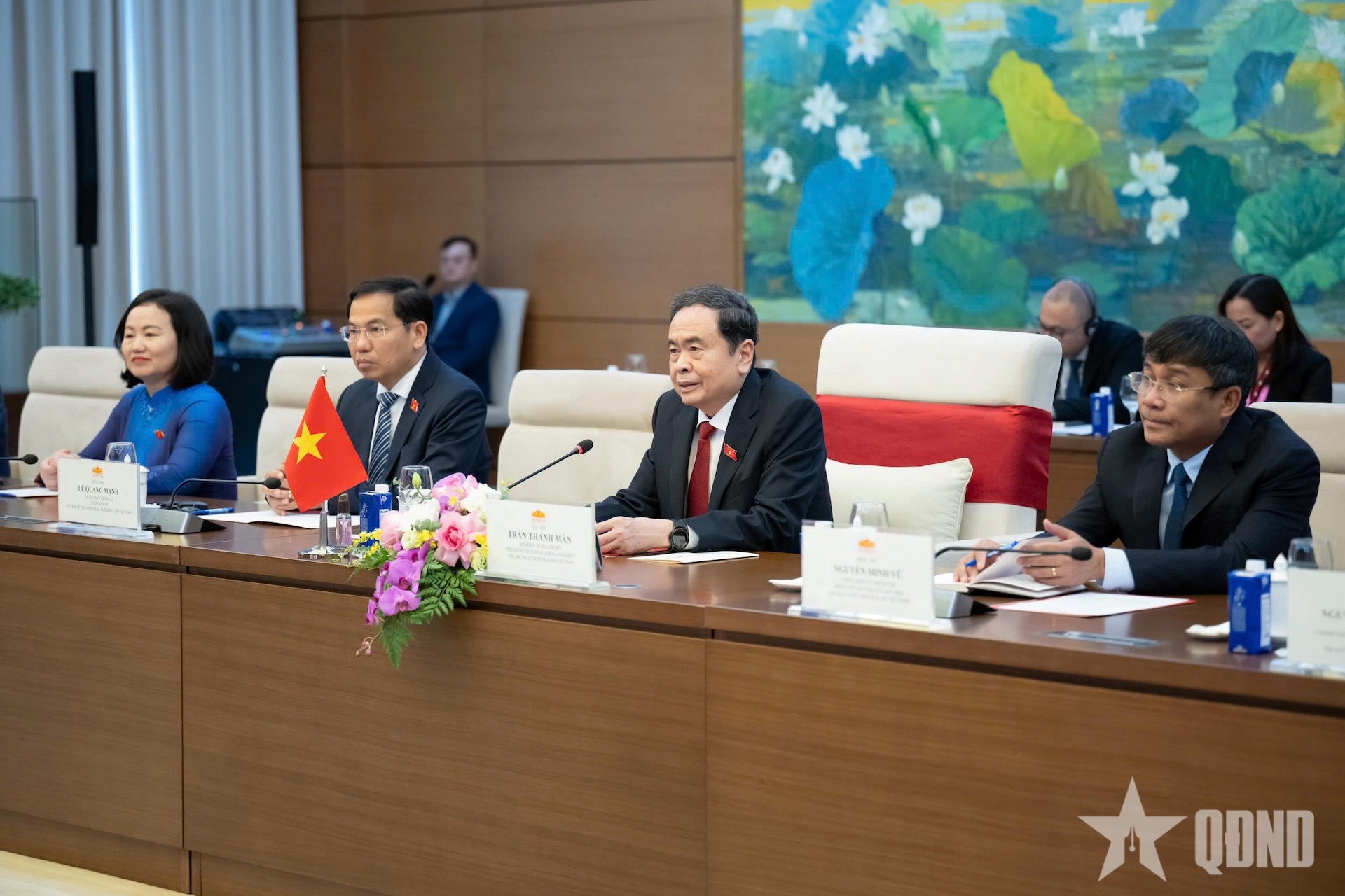 Chủ tịch Quốc hội Trần Thanh Mẫn và các đại biểu phía Việt Nam tại cuộc tiếp.