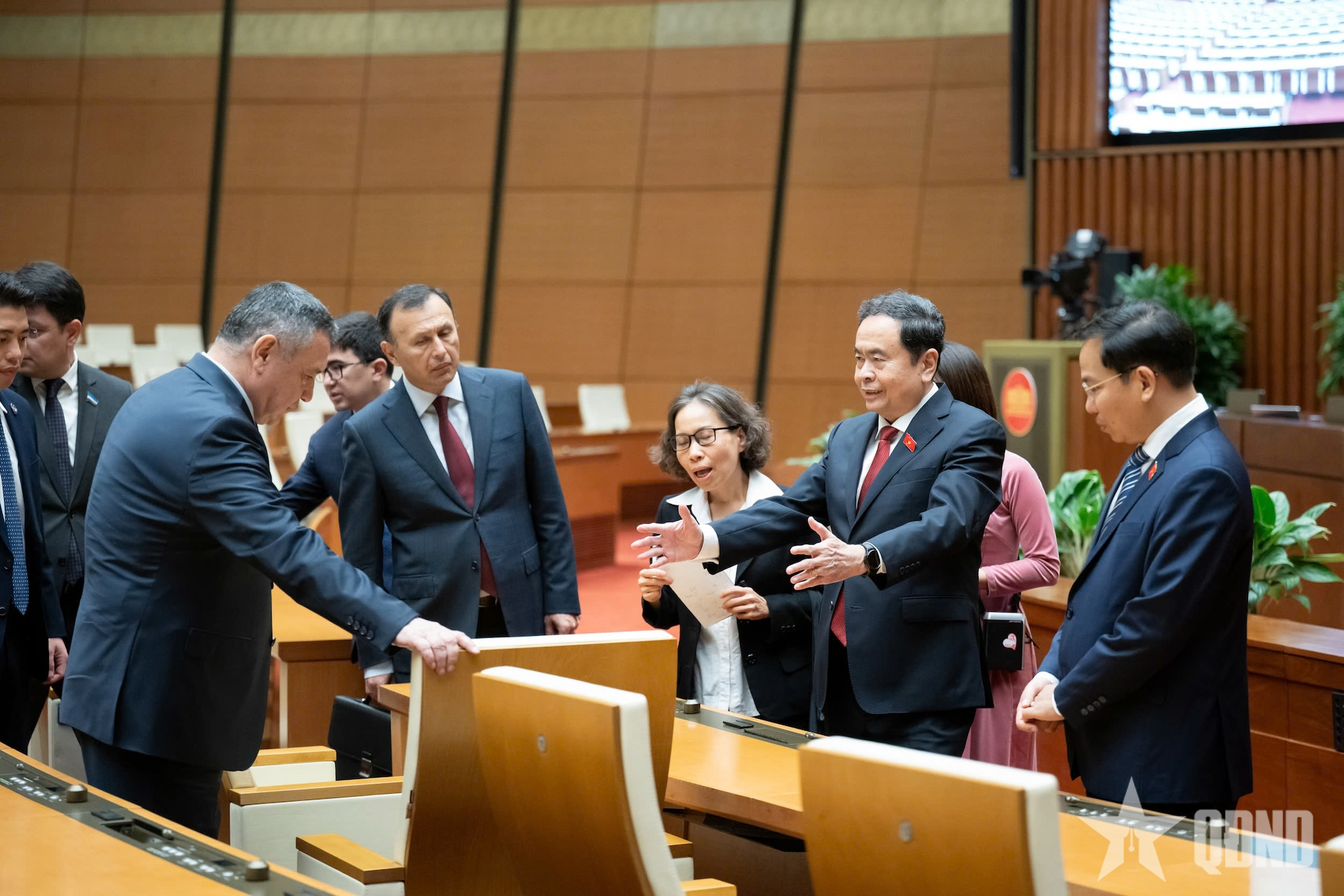 Chủ tịch Quốc hội Trần Thanh Mẫn cùng Chủ tịch Hạ viện Uzbekistan Nuriddin Ismoilov tham quan Phòng họp Diên Hồng, Nhà Quốc hội.