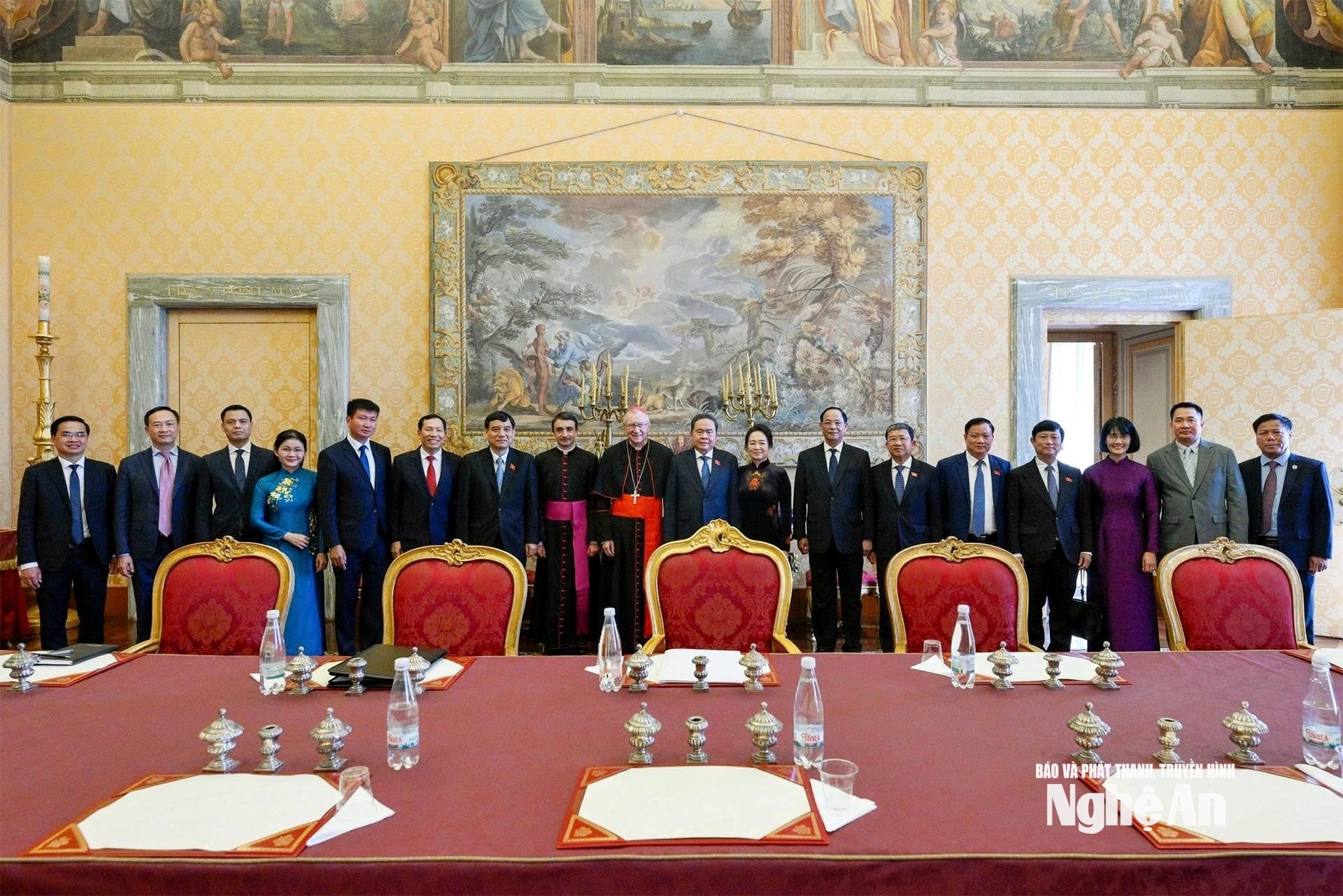 Chủ tịch Quốc hội Trần Thanh Mẫn và Phu nhân, Thủ tướng Tòa thánh Vatican Pietro Parolin cùng các đại biểu tham dự cuộc gặp chụp ảnh lưu niệm. Ảnh: Đ.D