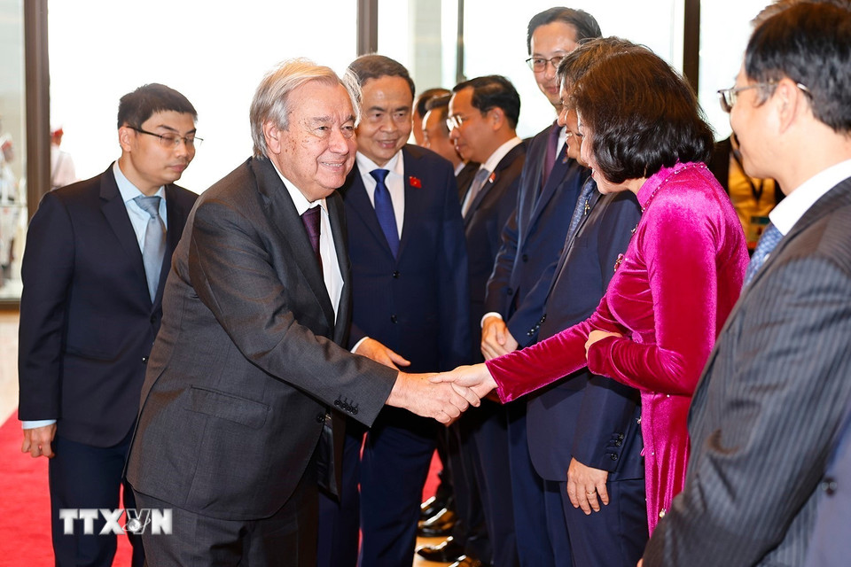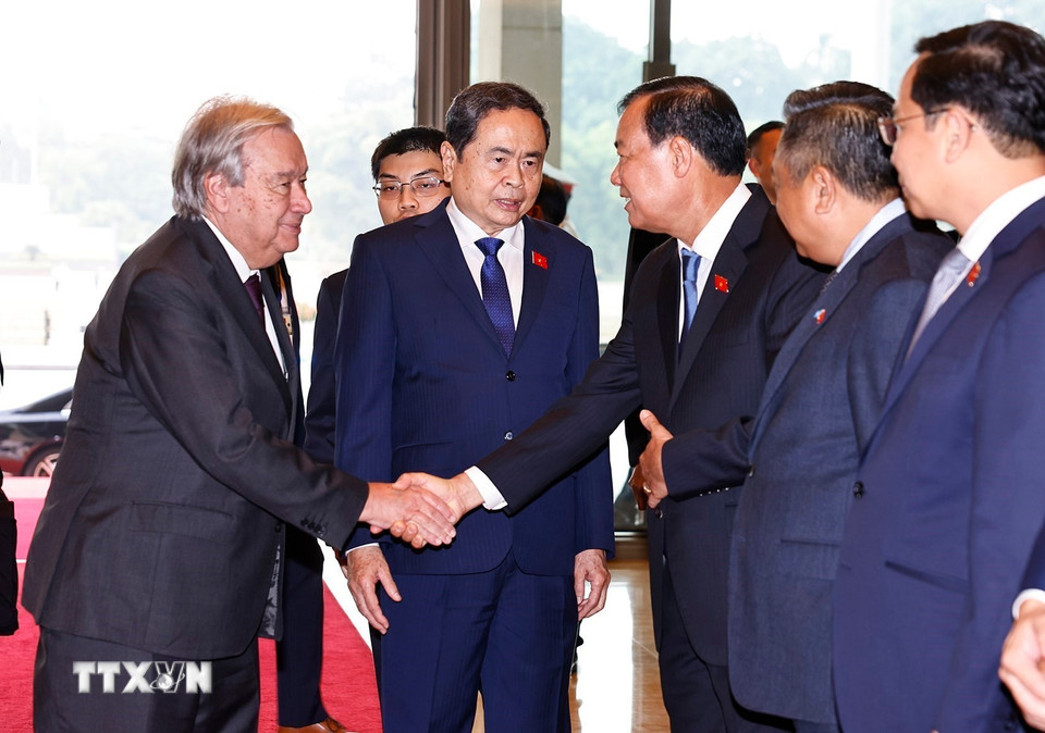 Chủ tịch Quốc hội Trần Thanh Mẫn đón Tổng Thư ký Liên hợp quốc António Guterres. (Ảnh: Doãn Tấn/TTXVN)