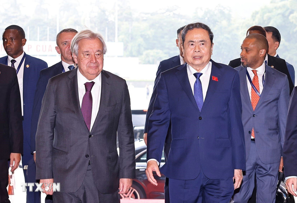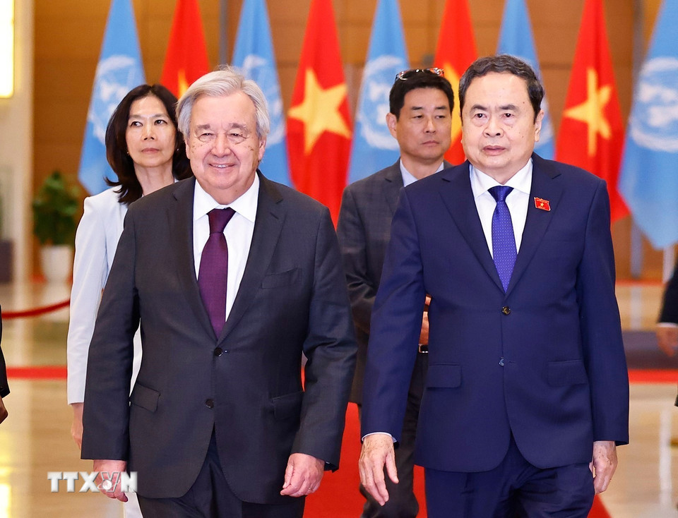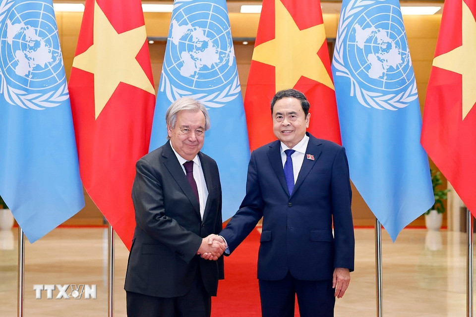 Chủ tịch Quốc hội Trần Thanh Mẫn và Tổng Thư ký Liên hợp quốc António Guterres. (Ảnh: Doãn Tấn/TTXVN)