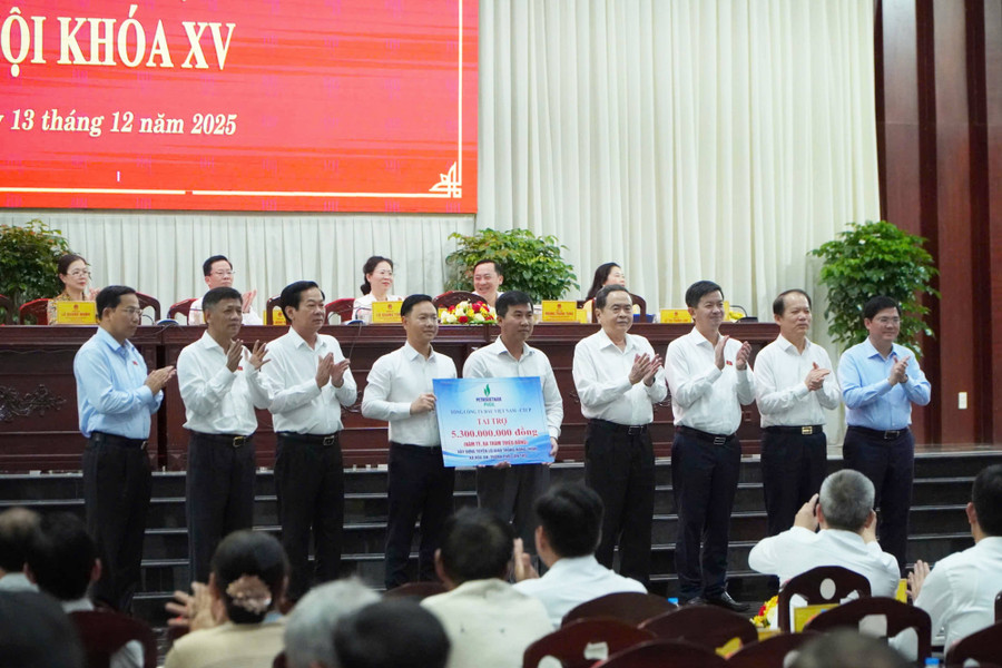 Chủ tịch Quốc hội Trần Thanh Mẫn chứng kiến lãnh đạo Tập đoàn Công nghiệp Năng lượng Quốc gia Việt Nam trao 5,3 tỷ đồng hỗ trợ xây dựng đường giao thông nông thôn.