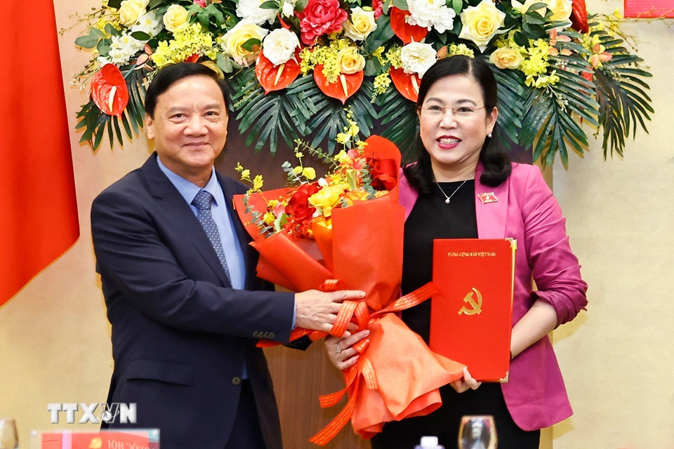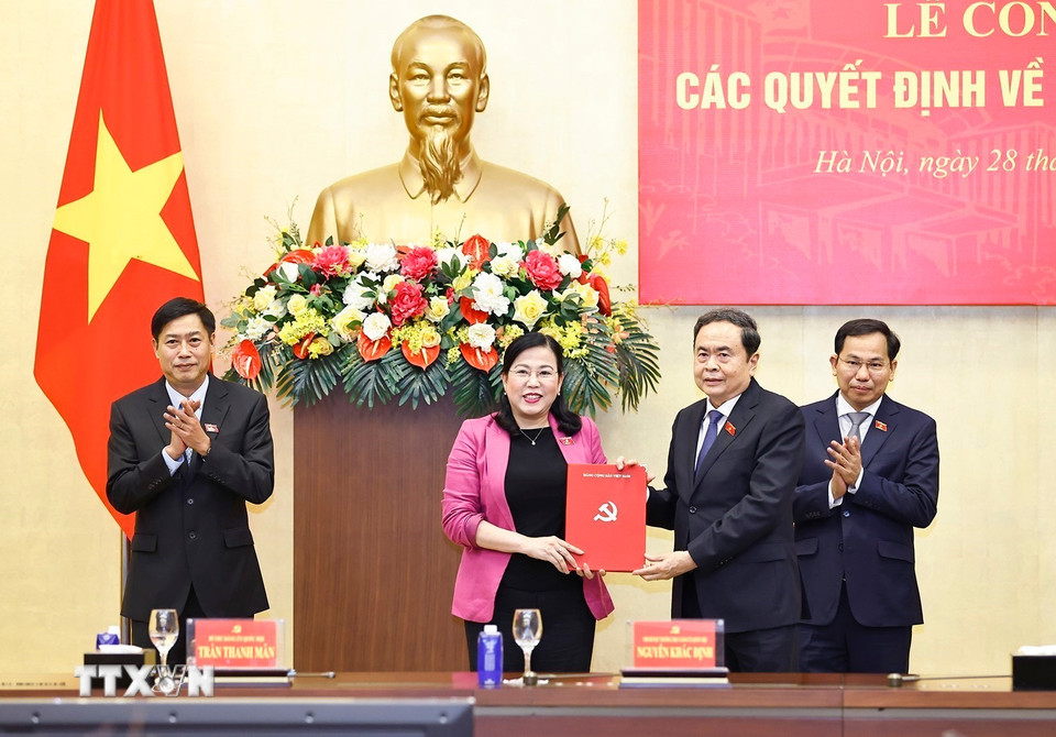 Chủ tịch Quốc hội Trần Thanh Mẫn trao Quyết định Bí thư Đảng ủy, Chủ nhiệm Ủy ban Khoa học, Công nghệ và Môi trường của Quốc hội cho bà Nguyễn Thanh Hải. (Ảnh: Doãn Tấn/TTXVN)