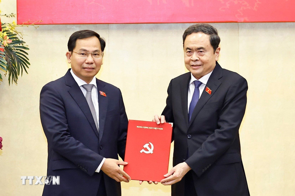 Chủ tịch Quốc hội Trần Thanh Mẫn trao Quyết định Bí thư Đảng ủy, Tổng thư ký Quốc hội, Chủ nhiệm Văn phòng Quốc hội cho ông Lê Quang Mạnh. (Ảnh: Doãn Tấn/TTXVN)
