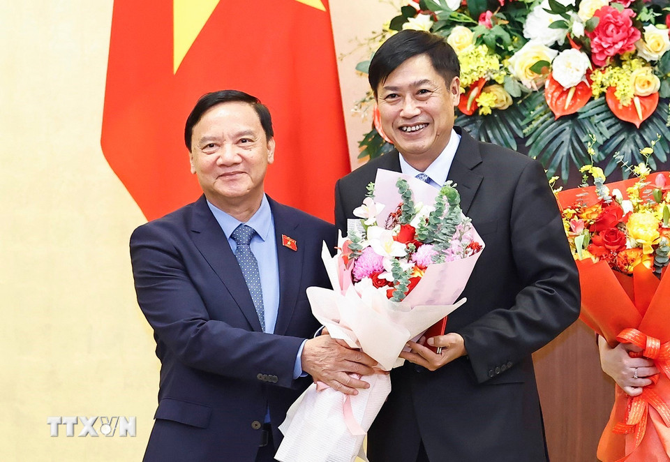 Chủ tịch Quốc hội Trần Thanh Mẫn và lãnh đạo Quốc hội trao các Quyết định và tặng hoa chúc mừng. (Ảnh: Doãn Tấn/TTXVN)