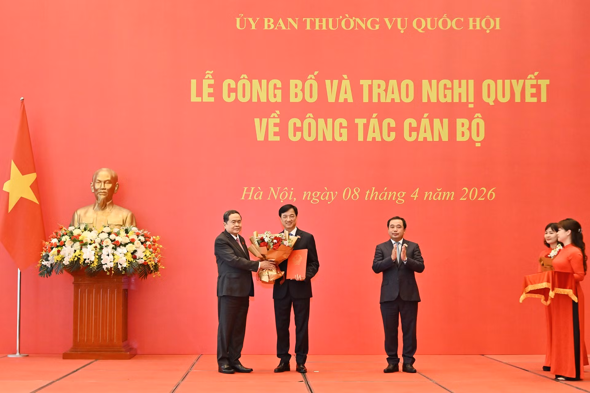 Chủ tịch Quốc hội Trần Thanh Mẫn trao Nghị quyết về chuyển sinh hoạt Đoàn Đại biểu Quốc hội đối với Ủy viên Bộ Chính trị, Bí thư Trung ương Đảng, Trưởng Ban Tổ chức Trung ương Nguyễn Duy Ngọc và Ủy viên Bộ Chính trị, Bí thư Thành ủy Hà Nội Trần Đức Thắng. (Ảnh: THỦY NGUYÊN)