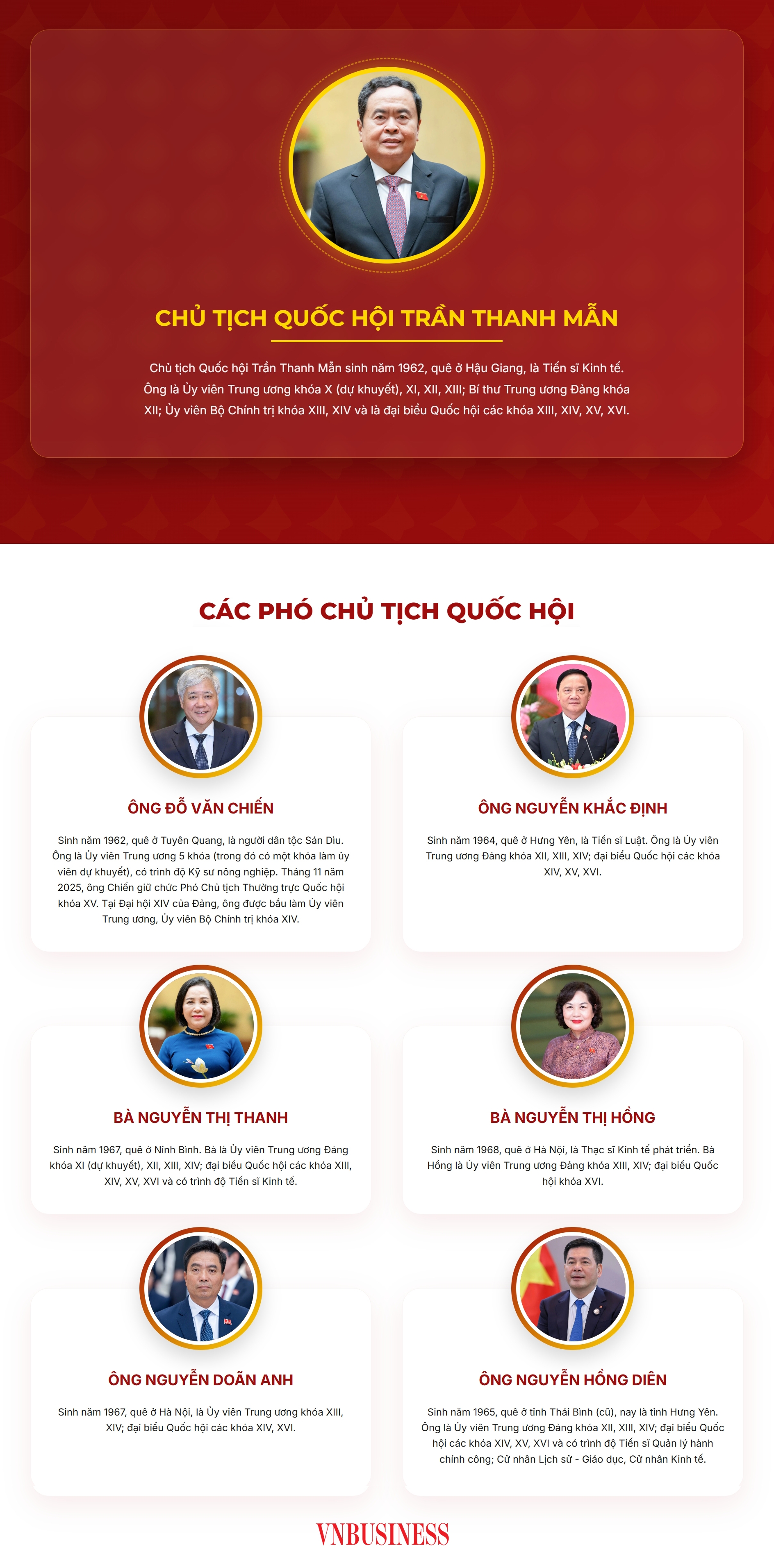 Theo các nghị quyết đã được thông qua, Quốc hội khóa XVI có 6 Phó Chủ tịch, gồm các ông, bà: Đỗ Văn Chiến, Nguyễn Khắc Định, Nguyễn Doãn Anh, Nguyễn Thị Thanh, Nguyễn Thị Hồng và Nguyễn Hồng Diên.