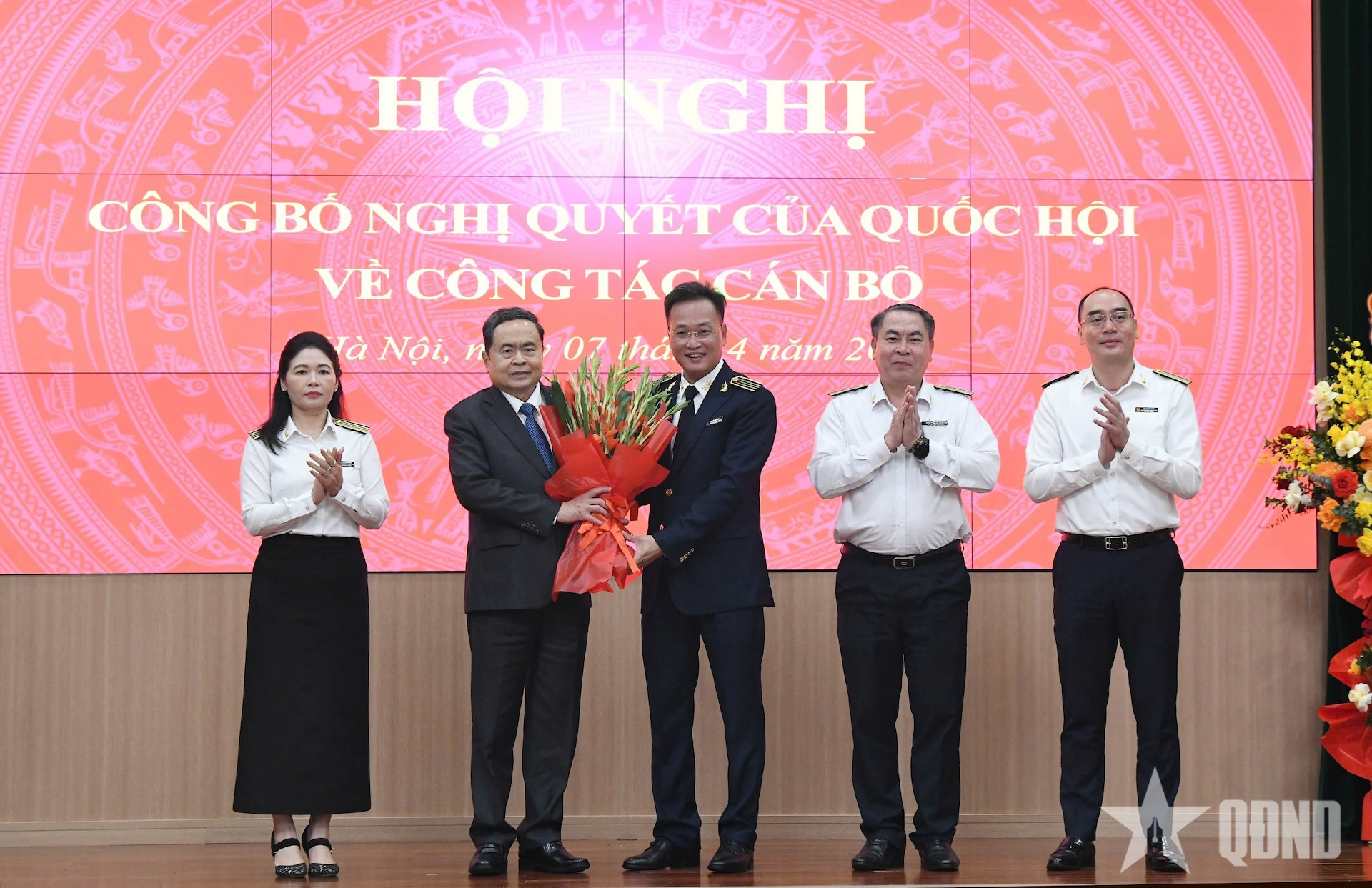Chủ tịch Quốc hội Trần Thanh Mẫn nhận bó hoa chúc mừng của lãnh đạo Tổng Kiểm toán Nhà nước.