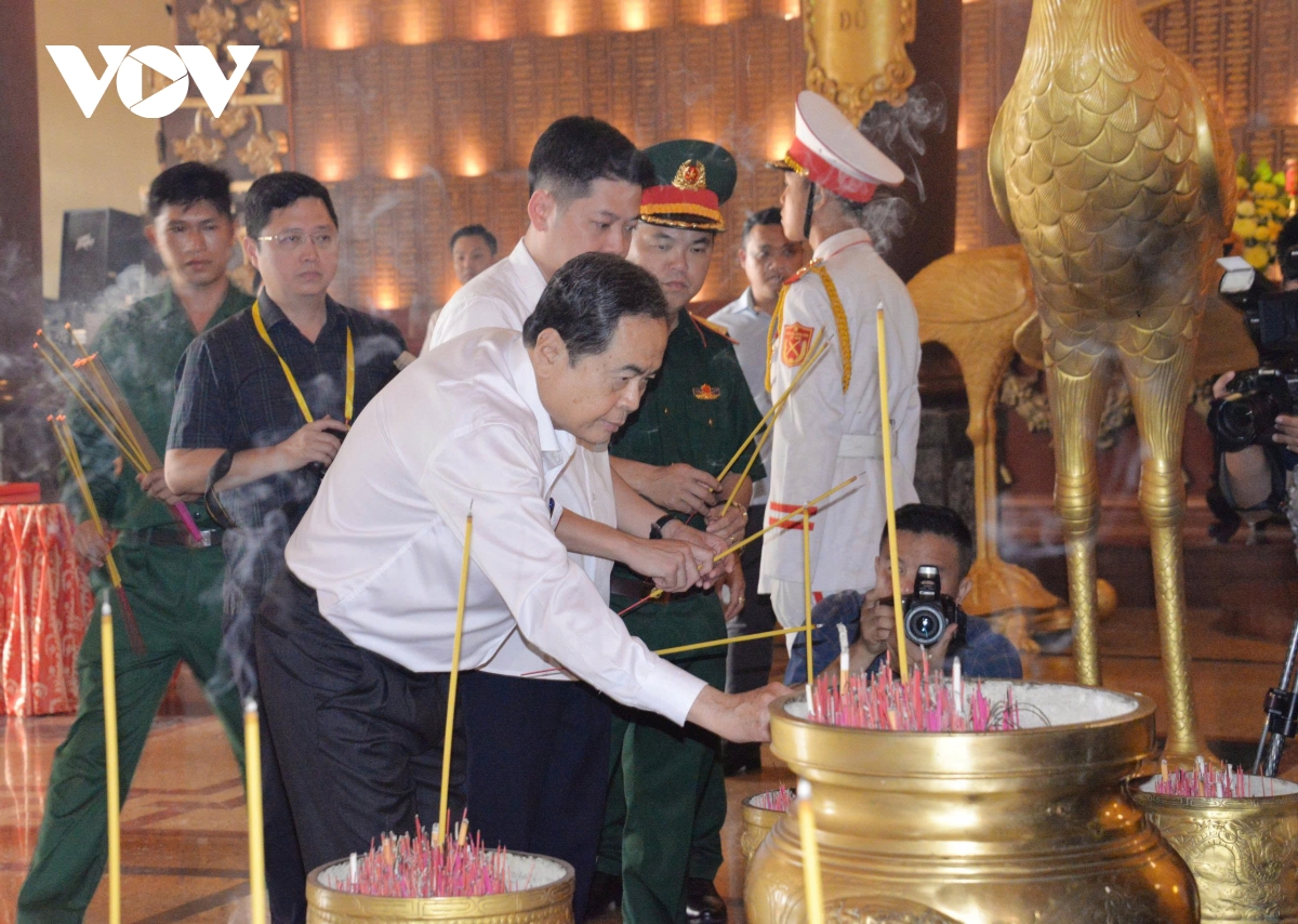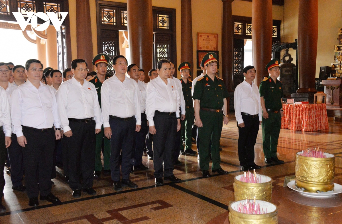 Chủ tịch Quốc hội Trần Thanh Mẫn và Đoàn công tác thành kính dâng hương, dâng hoa, tỏ lòng biết ơn vô hạn đối với những người đã chiến đấu, hy sinh anh dũng vì sự nghiệp giải phóng dân tộc, xây dựng và bảo vệ Tổ quốc Việt Nam xã hội chủ nghĩa.