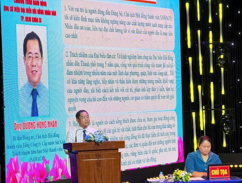 Tại buổi tiếp xúc cử tri, ông Dương Hồng Nhân, Chủ tịch Hội đồng thành viên Tổng Công ty Cấp nước Sài Gòn TNHH MTV (SAWACO) đã trình bày báo cáo chương trình hành động và những cam kết quan trọng trong nhiệm kỳ tới.
