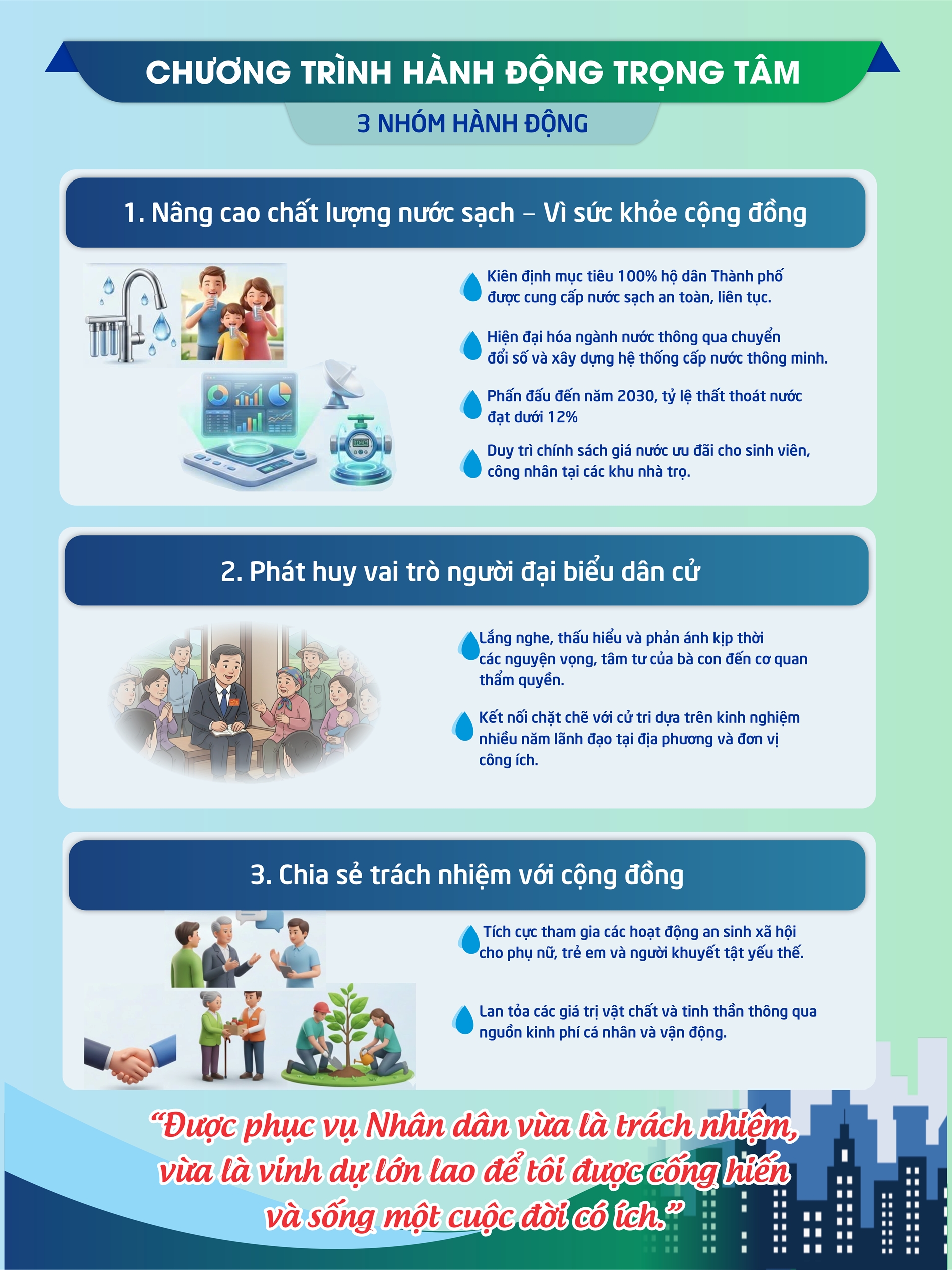 Cùng với đó, ông Dương Hồng Nhân cũng cam kết duy trì chỉ tiêu 100% hộ dân TP.HCM được cung cấp nước sạch; đẩy mạnh công tác giảm thất thoát nước bền vững và đạt hiệu quả kinh tế phấn đấu đến năm 2030 đạt tỷ lệ thất thoát nước dưới 12%; hiện đại hóa ngành nước, xây dựng hệ thống cấp nước thông minh; tiếp tục đẩy mạnh chuyển đổi số…