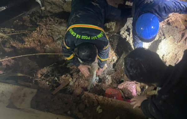Cháu D. được lực lượng Công an giải cứu thành công dưới đống đất đá.