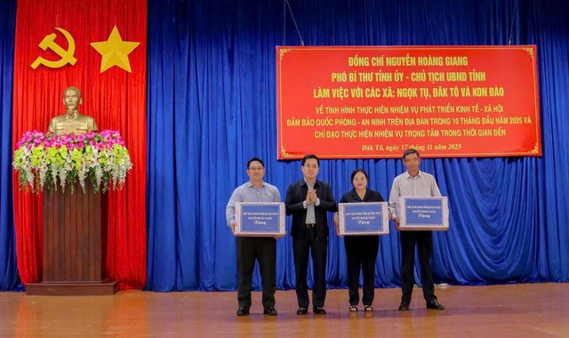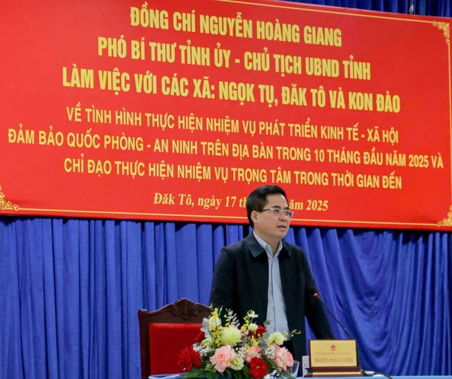 Ngày 17/11, Chủ tịch UBND tỉnh Nguyễn Hoàng Giang chủ trì buổi làm việc với lãnh đạo 3 xã lãnh đạo ba xã Đăk Tô, Ngọc Tụ và Kon Đào. Tham dự buổi làm việc có lãnh đạo các sở, ngành của tỉnh; Thường trực Đảng ủy, HĐND, UBND, Ủy ban MTTQ Việt Nam các xã; cùng thủ trưởng cơ quan chuyên môn thuộc UBND, Công an và Ban Chỉ huy Quân sự các xã.