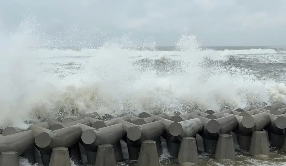 Thời điểm kiểm tra, sóng biển đánh dữ dội vào đê chắn sóng đang thi công. Những cột sóng cao vài mét cuồn cuộn đập vào bờ.