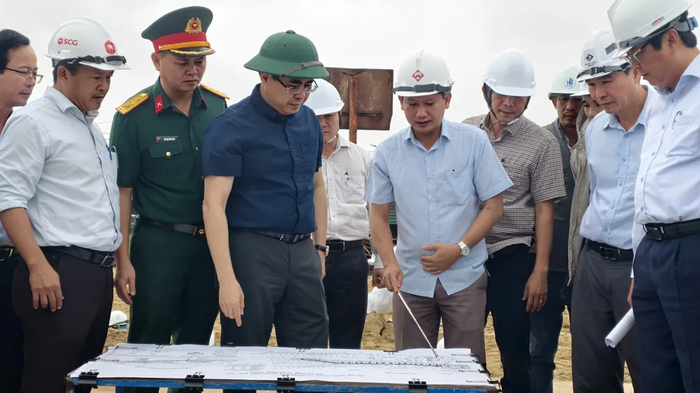 Ông Nguyễn Hoàng Giang, Chủ tịch UBND tỉnh Quảng Ngãi (áo xanh) kiểm tra tiến độ dự án.