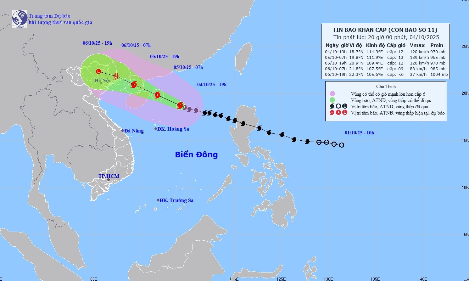 Bản đồ dự báo quỹ đạo và cường độ bão số 11 lúc 20h ngày 4-10. Ảnh: Nchmf