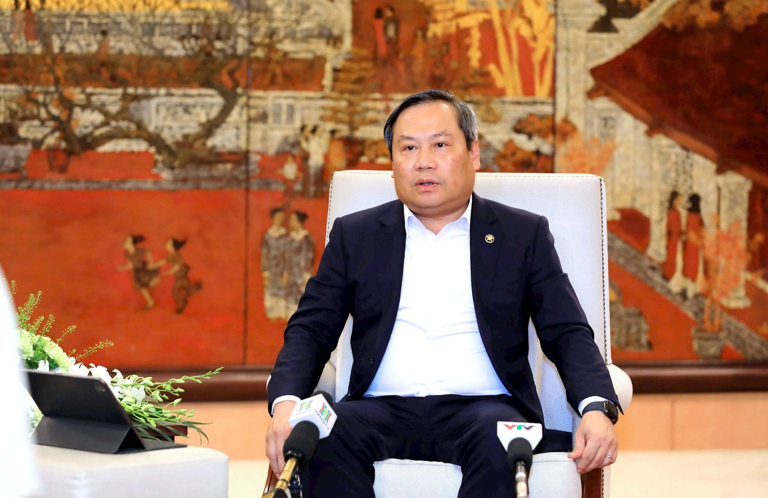 Ủy viên Trung ương Đảng, Phó Bí thư Thành ủy, Chủ tịch UBND thành phố Hà Nội Vũ Đại Thắng trả lời phỏng vấn. Ảnh: Đình Hiệp