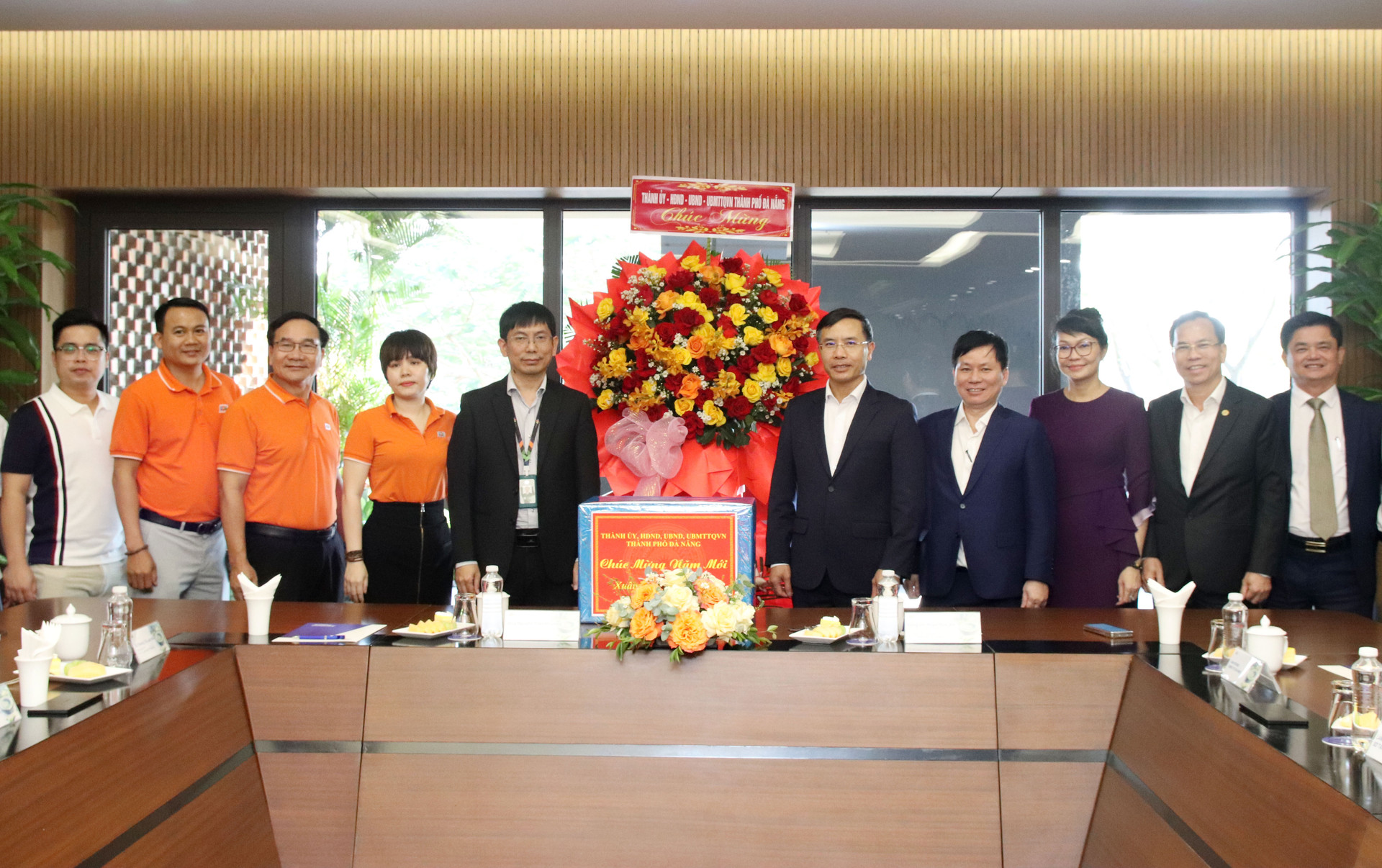 Chủ tịch UBND thành phố Phạm Đức Ấn thăm, chúc mừng Công ty TNHH Phần mềm FPT miền Trung. Ảnh: TRỌNG HUY