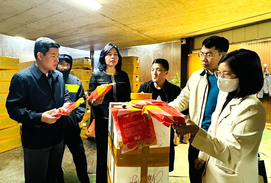 Đoàn kiểm tra liên ngành số 01 của thành phố Hà Nội kiểm tra mặt hàng thịt gia súc, gia cầm tại Công ty TNHH Kinh doanh thực phẩm Tiến Phát (phường Đông Ngạc). Ảnh: Quỳnh Dung