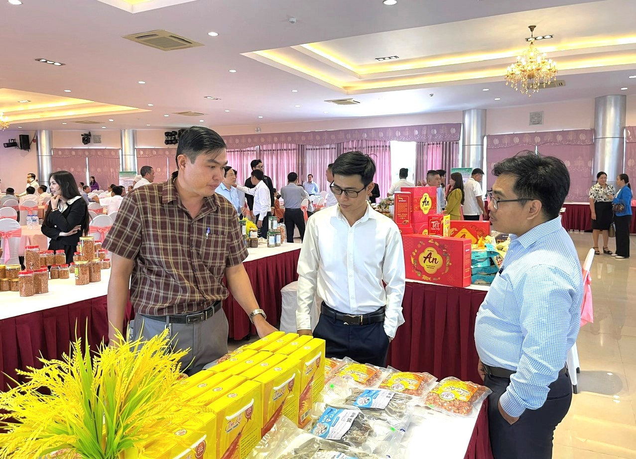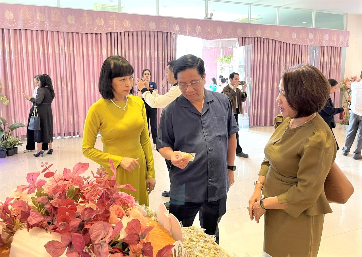 Chủ tịch UBND tỉnh Hồ Văn Mừng và các đại biểu tham quan các gian hàng trưng bày sản phẩm đặc trưng của tỉnh An Giang