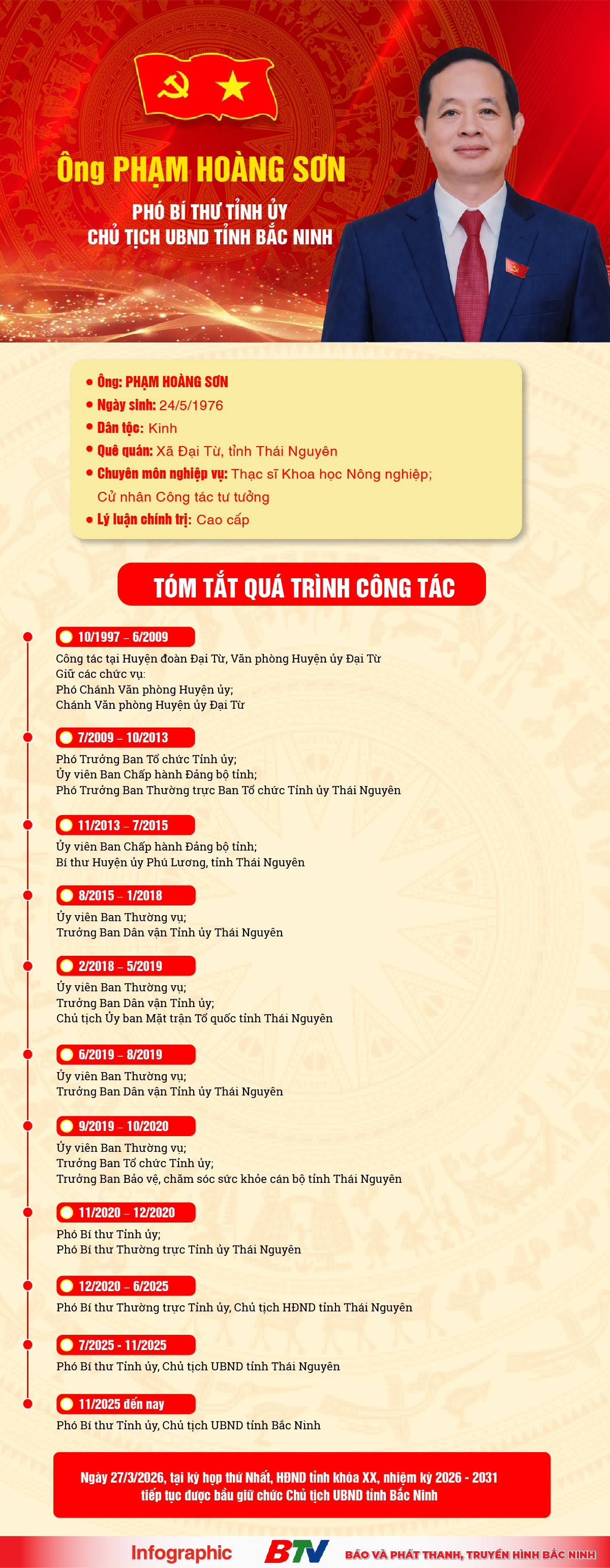BẮC NINH – Chiều 27/3, tại kỳ họp thứ Nhất, Hội đồng nhân dân tỉnh Bắc Ninh khóa XX, nhiệm kỳ 2026 – 2031 đã bầu ông Phạm Hoàng Sơn, Phó Bí thư Tỉnh ủy, Chủ tịch UBND tỉnh Bắc Ninh nhiệm kỳ 2021 - 2026 giữ chức vụ Chủ tịch UBND tỉnh Bắc Ninh nhiệm kỳ 2026 - 2031. Báo và Phát thanh, Truyền hình Bắc Ninh trân trọng giới thiệu quá trình công tác của Chủ tịch UBND tỉnh Bắc Ninh Phạm Hoàng Sơn.