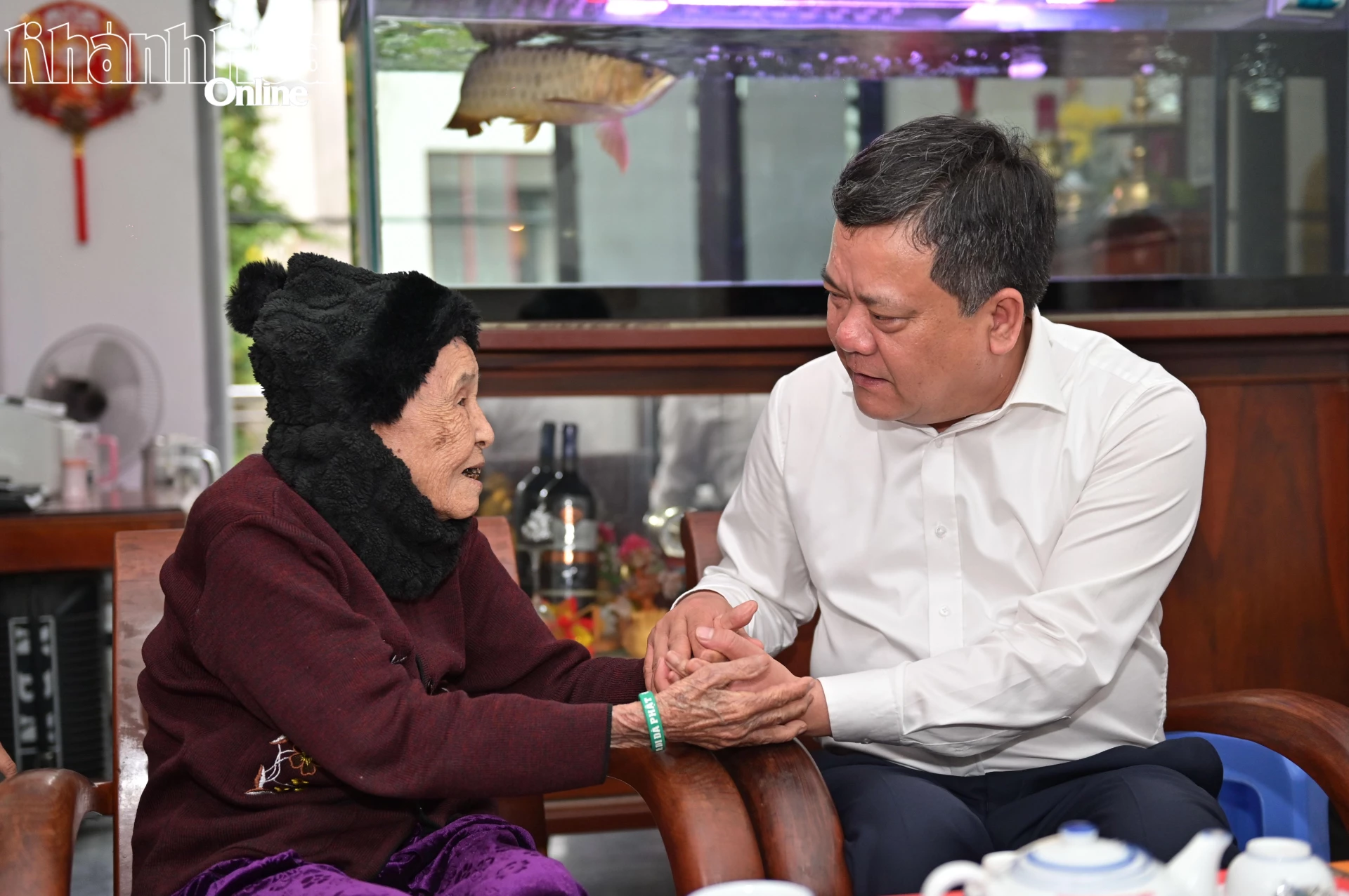 Chủ tịch UBND tỉnh Trần Phong thăm hỏi sức khỏe, chúc mừng năm mới Bà mẹ Việt Nam anh hùng Lê Thị Liên.