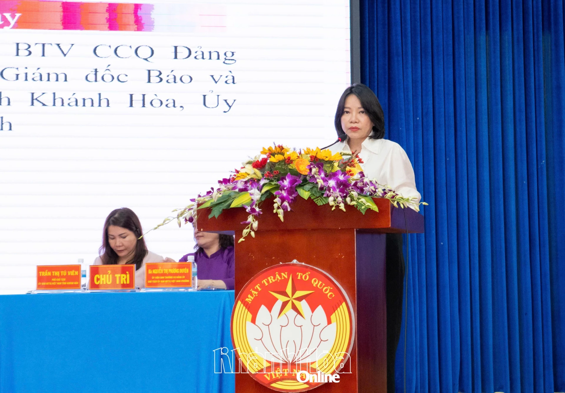 Giám đốc Báo và Phát thanh, Truyền hình Khánh Hòa Thái Thị Lệ Hằng trình bày chương trình hành động tại hội nghị.