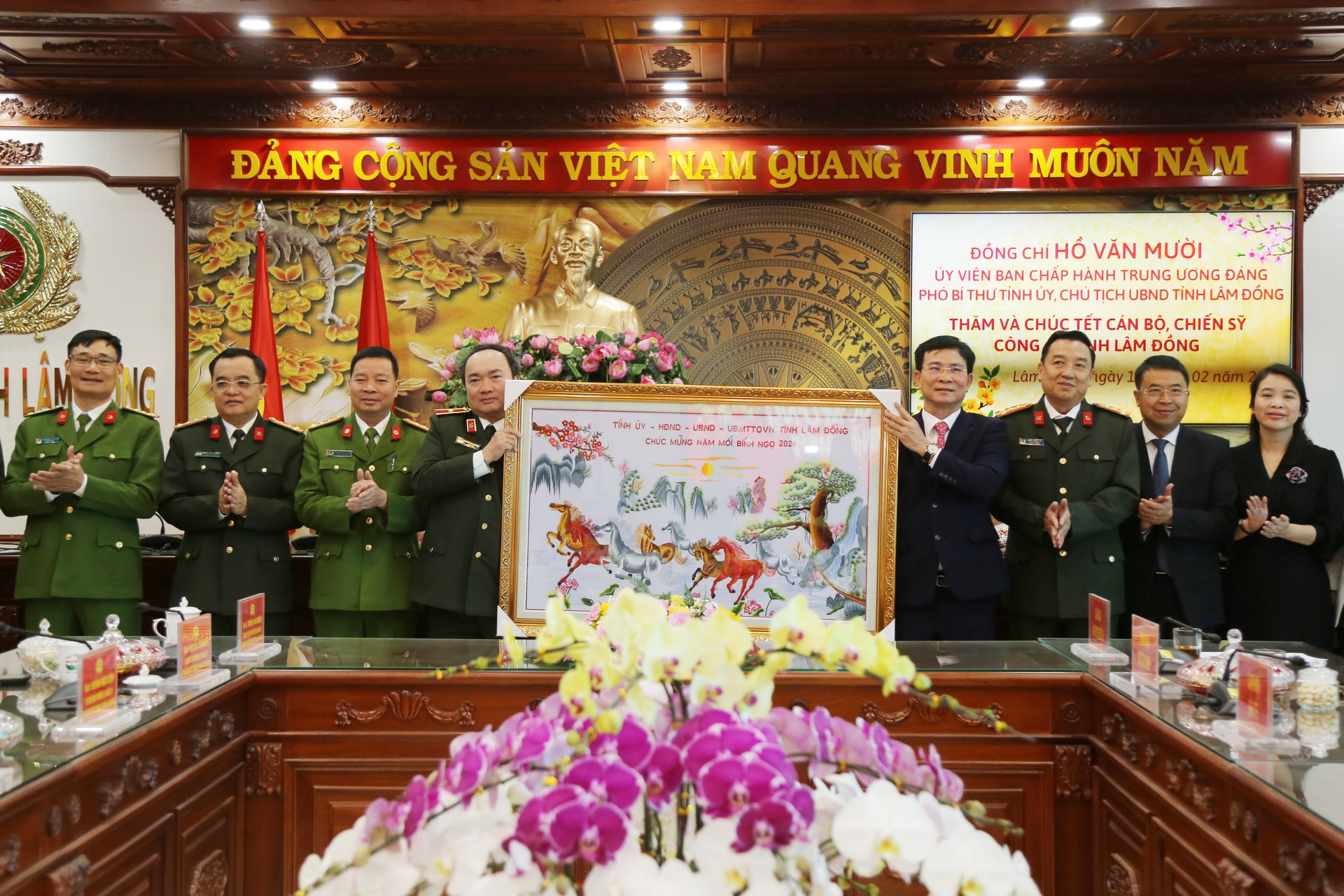 Ủy viên Ban Chấp hành Trung ương Đảng, Phó Bí thư Tỉnh ủy, Chủ tịch UBND tỉnh Lâm Đồng Hồ Văn Mười tặng bức tranh thêu với nhiều ý nghĩa trong năm mới đến lực lượng Công an tỉnh