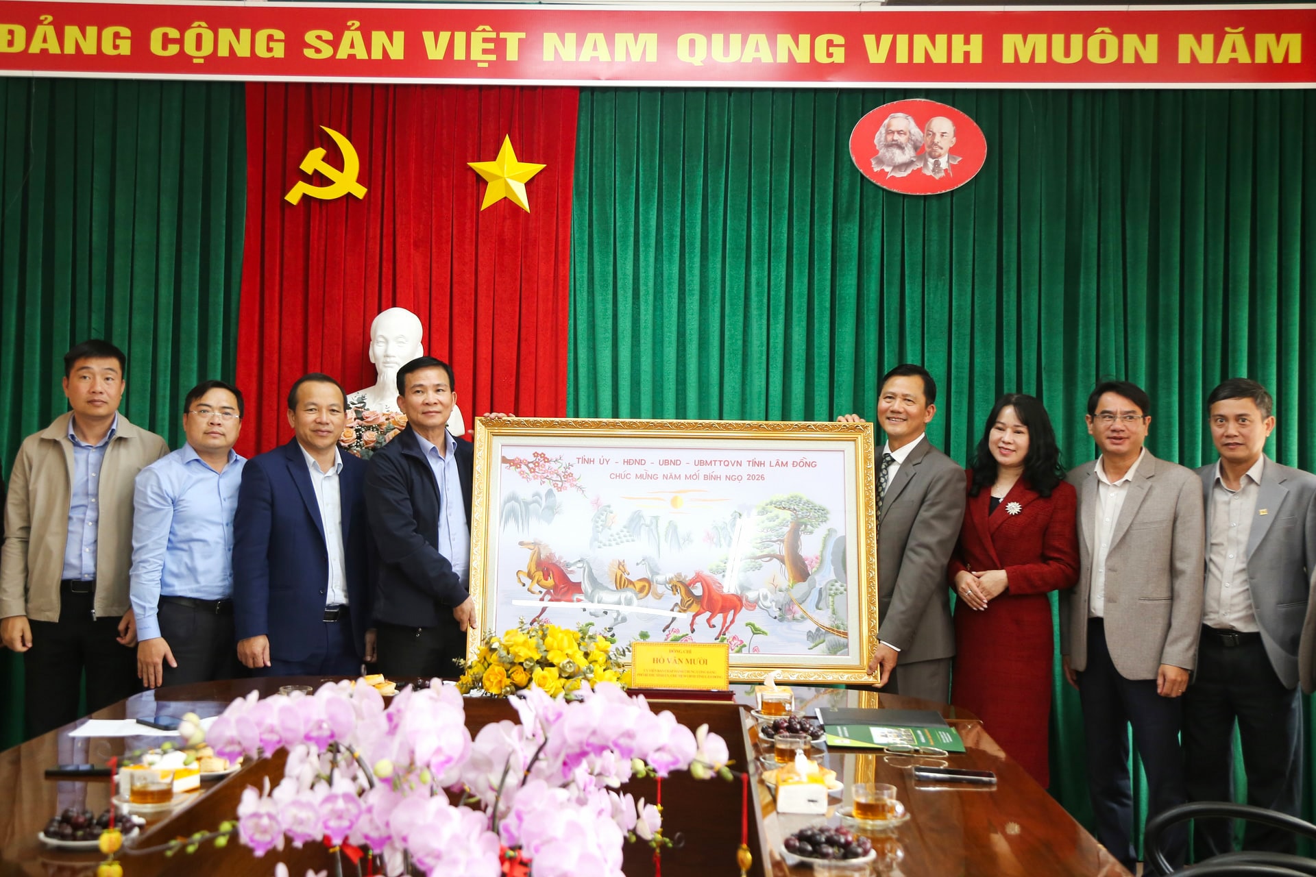 Ủy viên Ban Chấp hành Trung ương Đảng, Phó Bí thư Tỉnh ủy, Chủ tịch UBND tỉnh Hồ Văn Mười tặng bức tranh lưu niệm với thông điệp chúc Công ty TNHH MTV Xổ số kiến thiết Lâm Đồng một năm mới thành công trên nhiều lĩnh vực