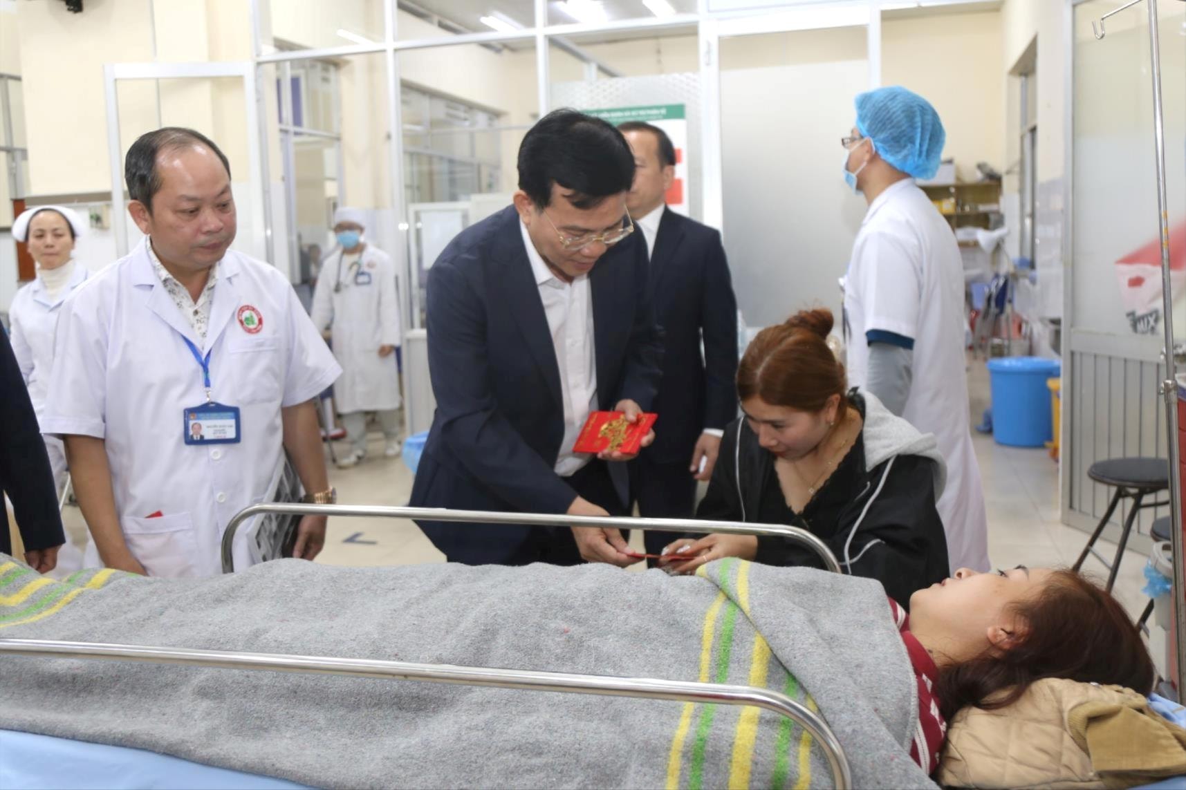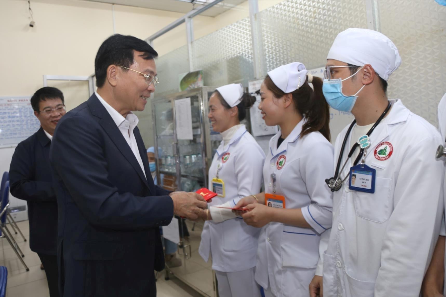Nhiều nhân viên Bệnh viện Đa khoa tỉnh Lâm Đồng nhận lời động viên và lì xì đầu năm mới của đồng chí Hồ Văn Mười, Ủy viên Trung ương Đảng, Phó Bí thư Tỉnh ủy, Chủ tịch UBND tỉnh Lâm Đồng
