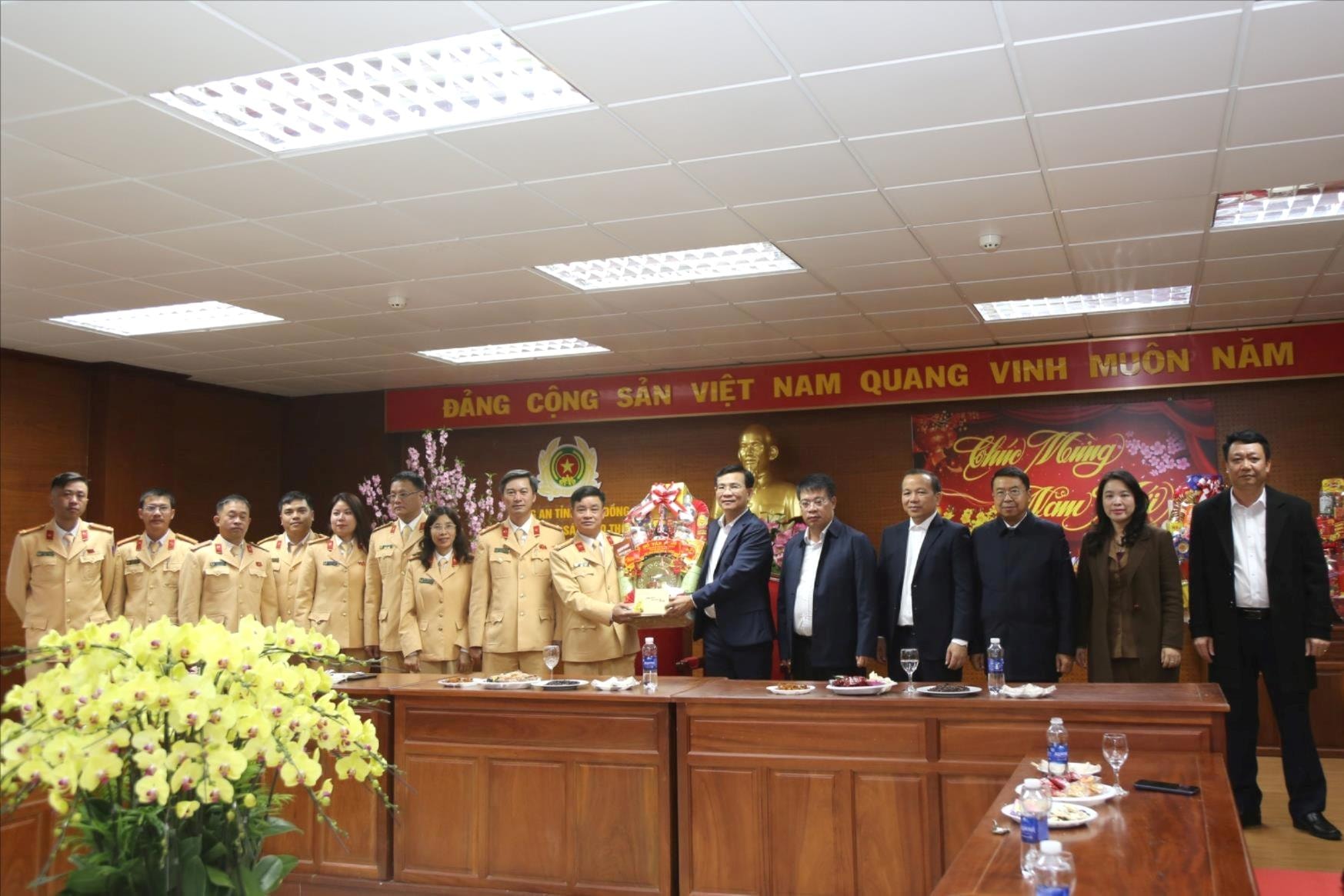 Cán bộ, chiến sỹ Phòng Cảnh sát Giao thông (Công an tỉnh) nhận quà và lời chúc năm mới đầy ý nghĩa từ lãnh đạo tỉnh