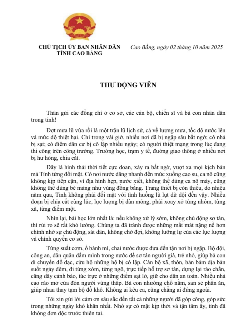 Sự sẻ chia, đồng lòng và tinh thần quả cảm của các đồng chí ở cơ sở, các cán bộ, chiến sĩ và bà con nhân dân là nguồn sức mạnh vô giá, thắp lên hy vọng và nghị lực để mỗi người dân Cao Bằng cùng nhau hàn gắn vết thương, xây dựng lại cuộc sống sau thiên tai.