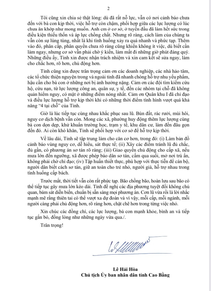 Phó Bí thư Tỉnh ủy, Chủ tịch UBND tỉnh Lê Hải Hòa gửi thư động viên các đồng chí ở cơ sở, các cán bộ, chiến sĩ và bà con nhân dân trong tỉnh đã đoàn kết, nỗ lực cống hiến công sức và tấm lòng trong những ngày thử thách khắc nghiệt nhất của thiên tai. Đồng thời, tri ân sâu sắc đến các doanh nghiệp, các nhà hảo tâm, các tổ chức thiện nguyện trong và ngoài tỉnh đã nhanh chóng hỗ trợ nhu yếu phẩm, hậu cần cho bà con ở những nơi bị ảnh hưởng nặng.