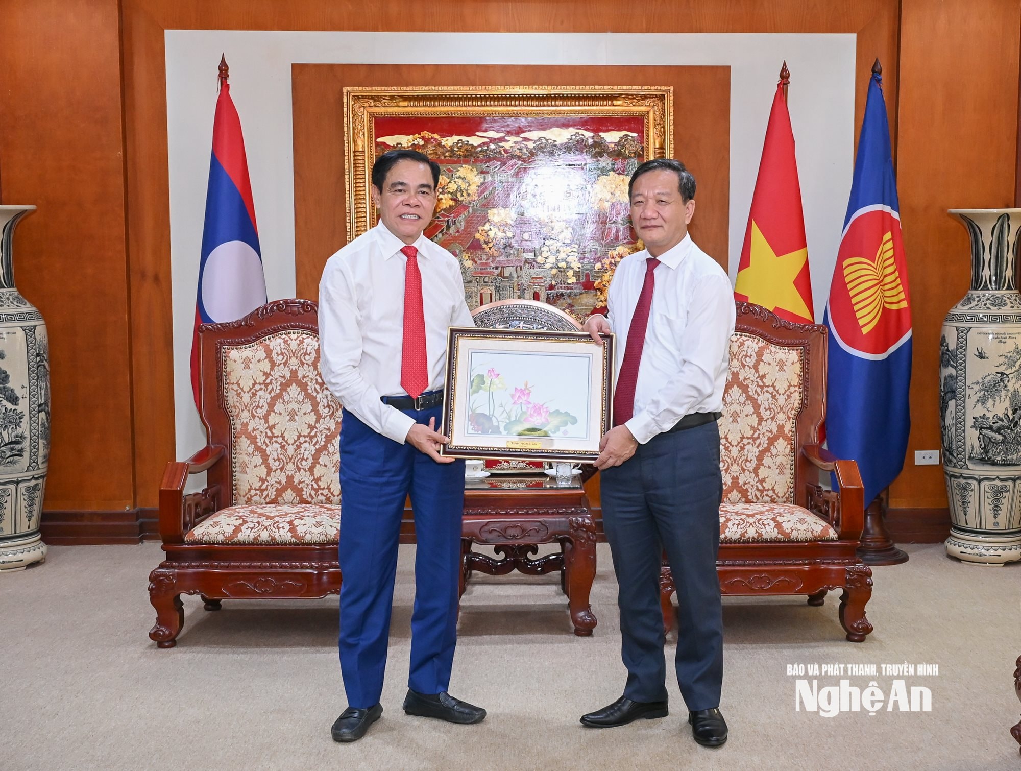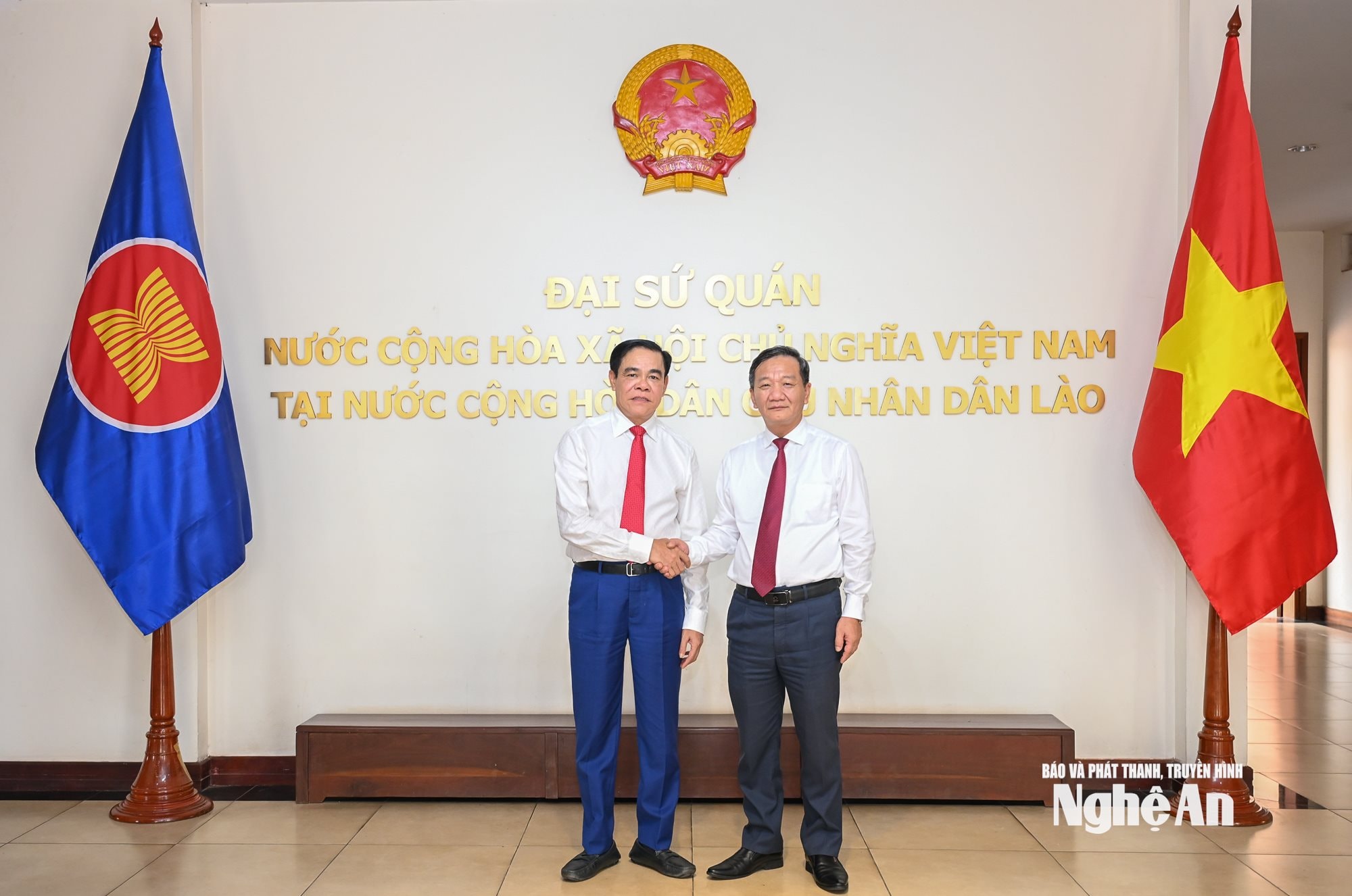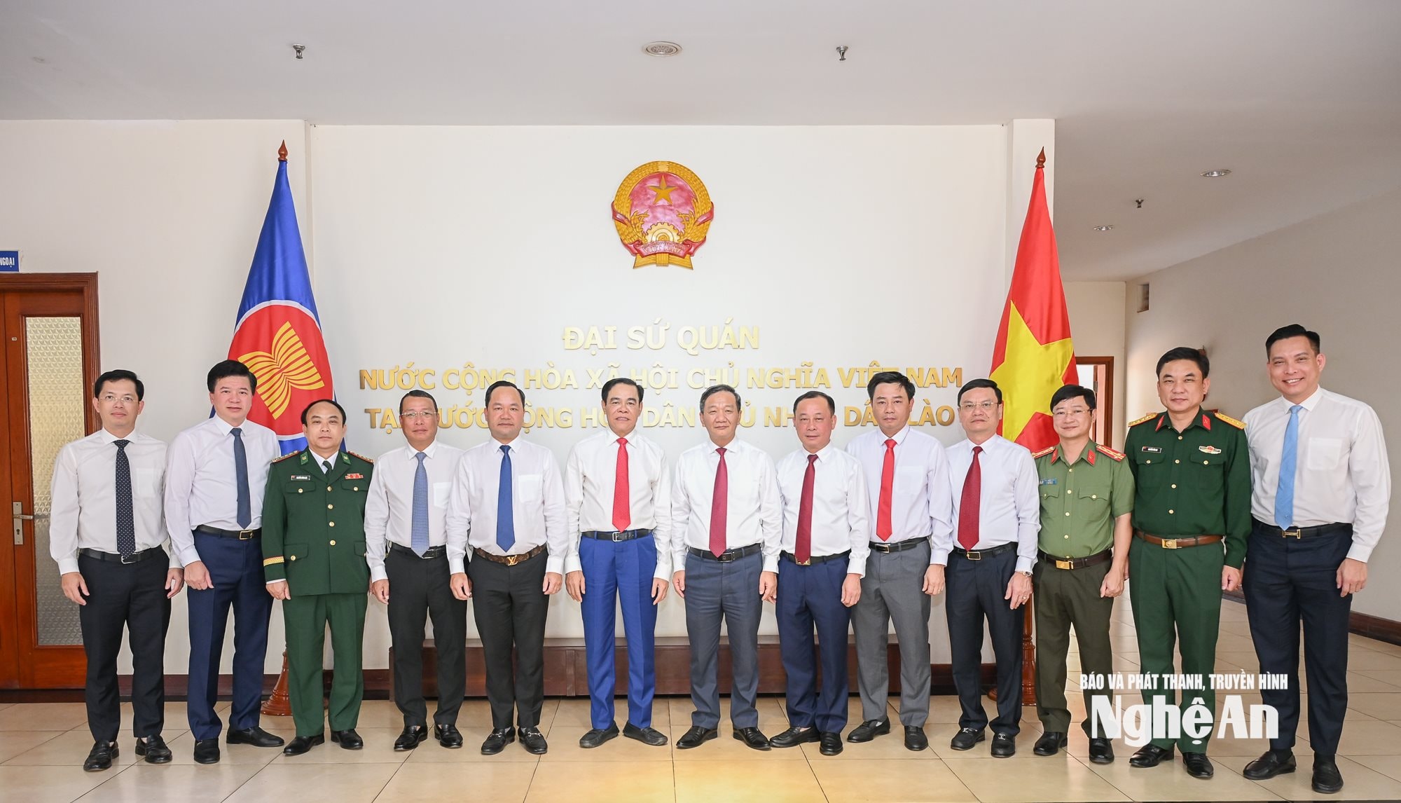Thăm Đại sứ quán Việt Nam tại Lào, Chủ tịch UBND tỉnh Nghệ An đã cập nhật những thành tựu kinh tế - xã hội nổi bật, đặc biệt là sự bứt phá trong thu hút đầu tư nước ngoài và phát triển hạ tầng giao thông trọng điểm của tỉnh trong thời gian qua.