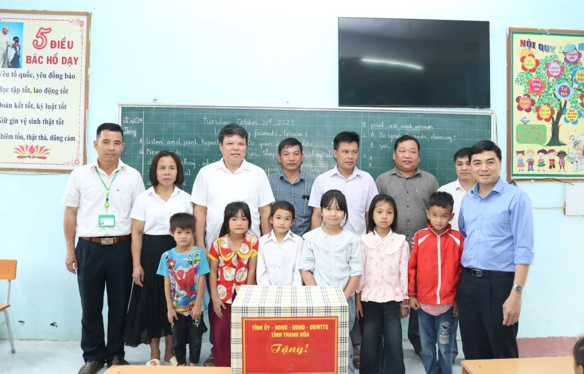 Chủ tịch UBND tỉnh Nguyễn Hoài Anh tặng quà cho tập thể giáo viên và học sinh tại điểm trường Cha Lung thuộc Trường Tiểu học bản Tam Thanh.