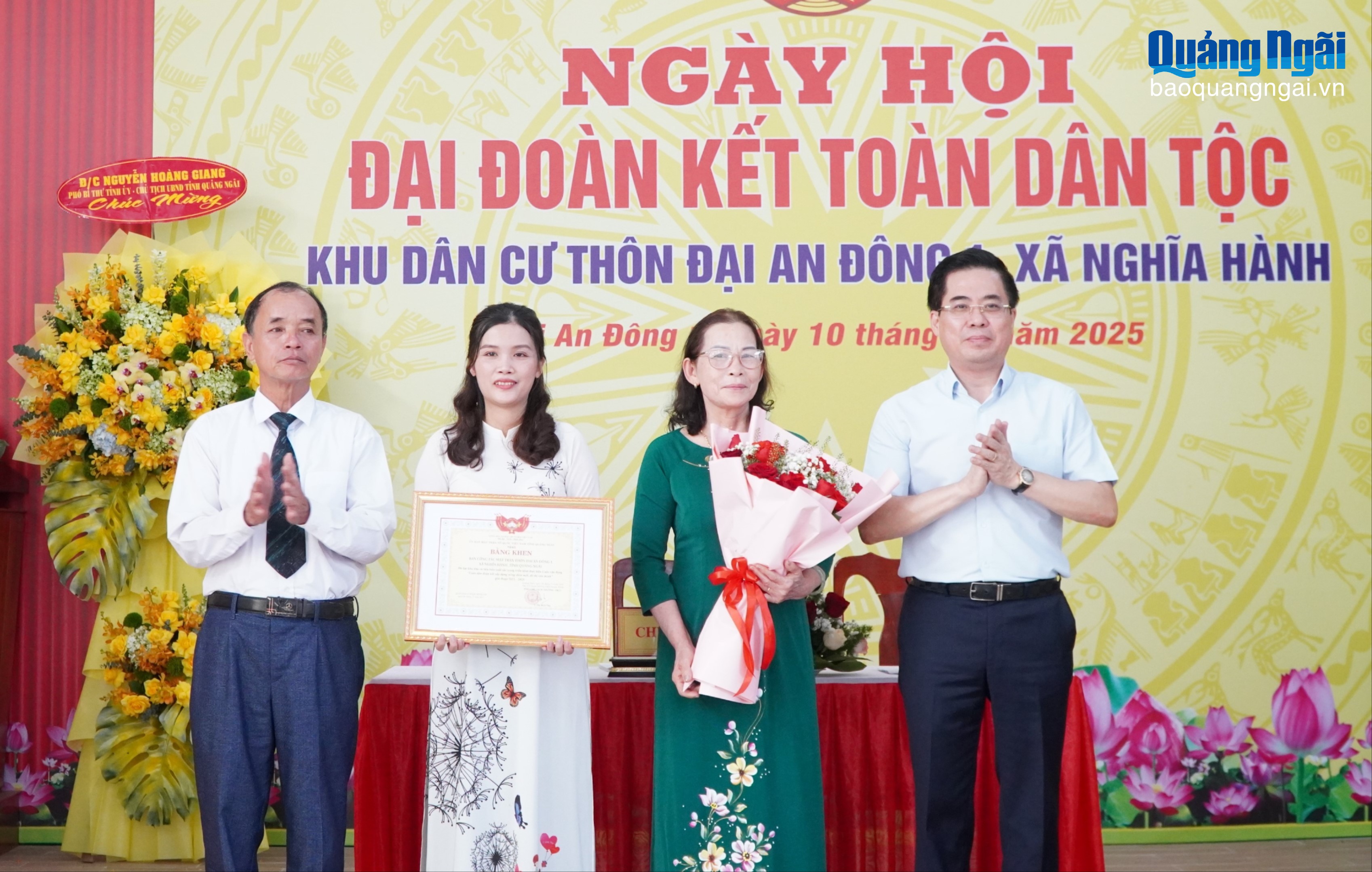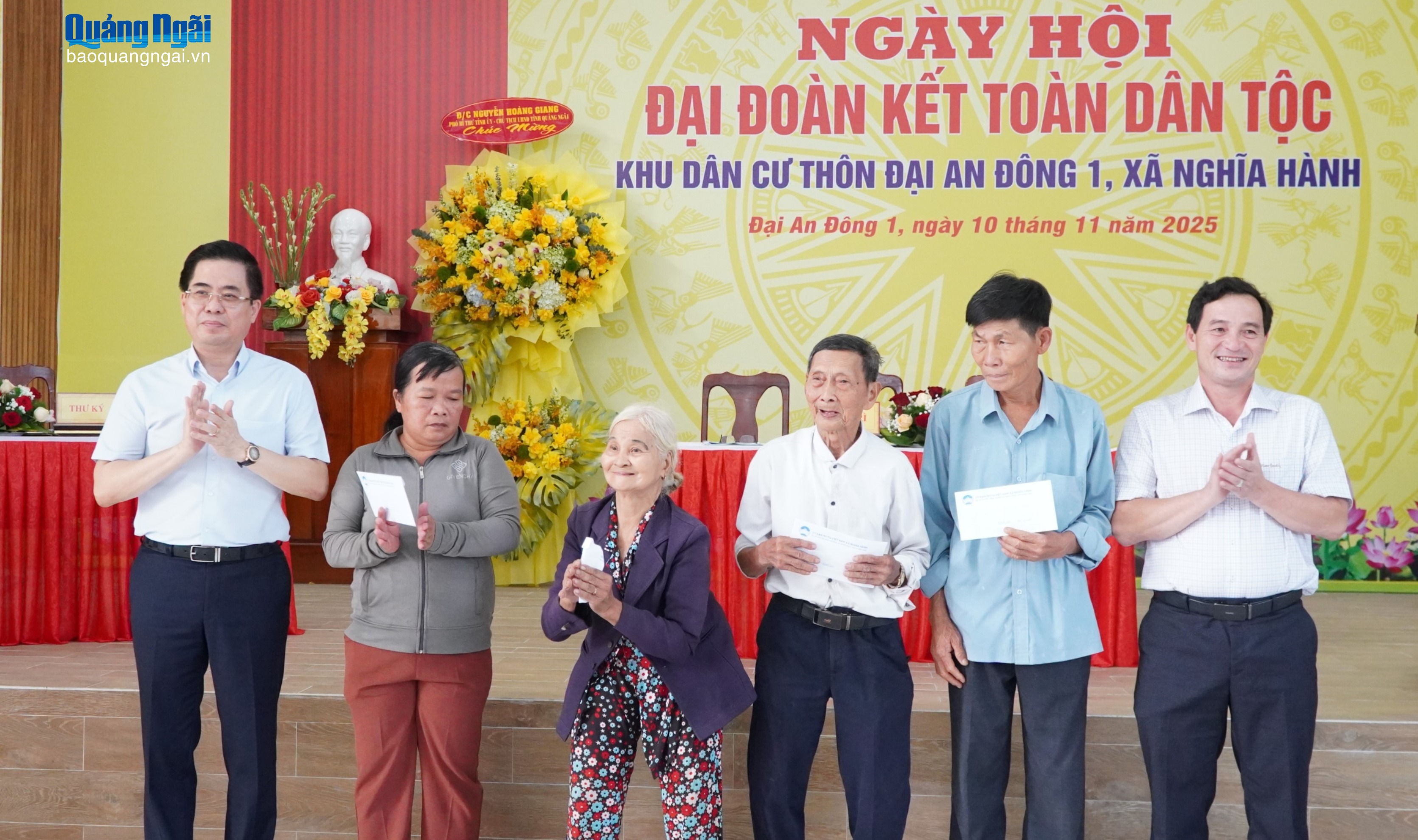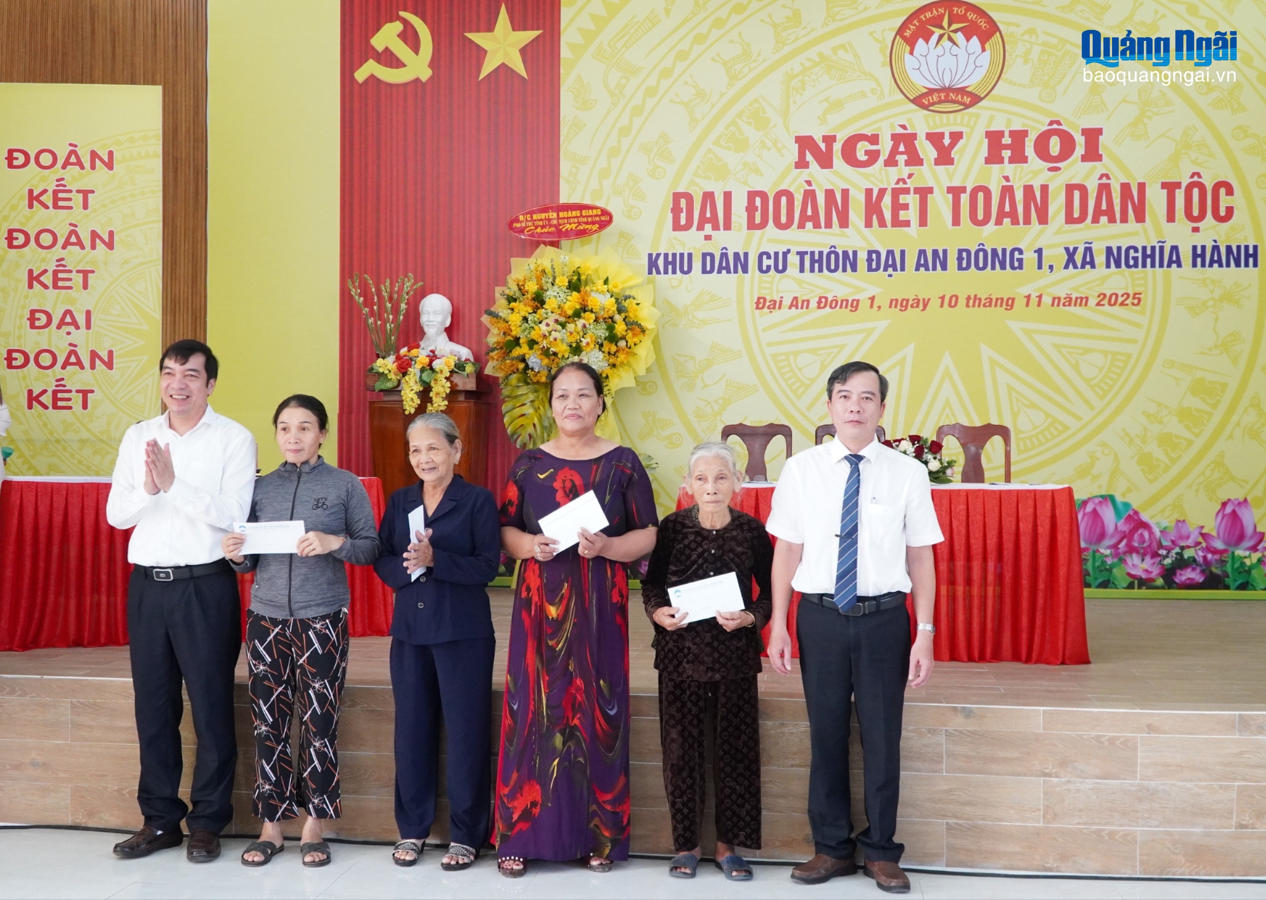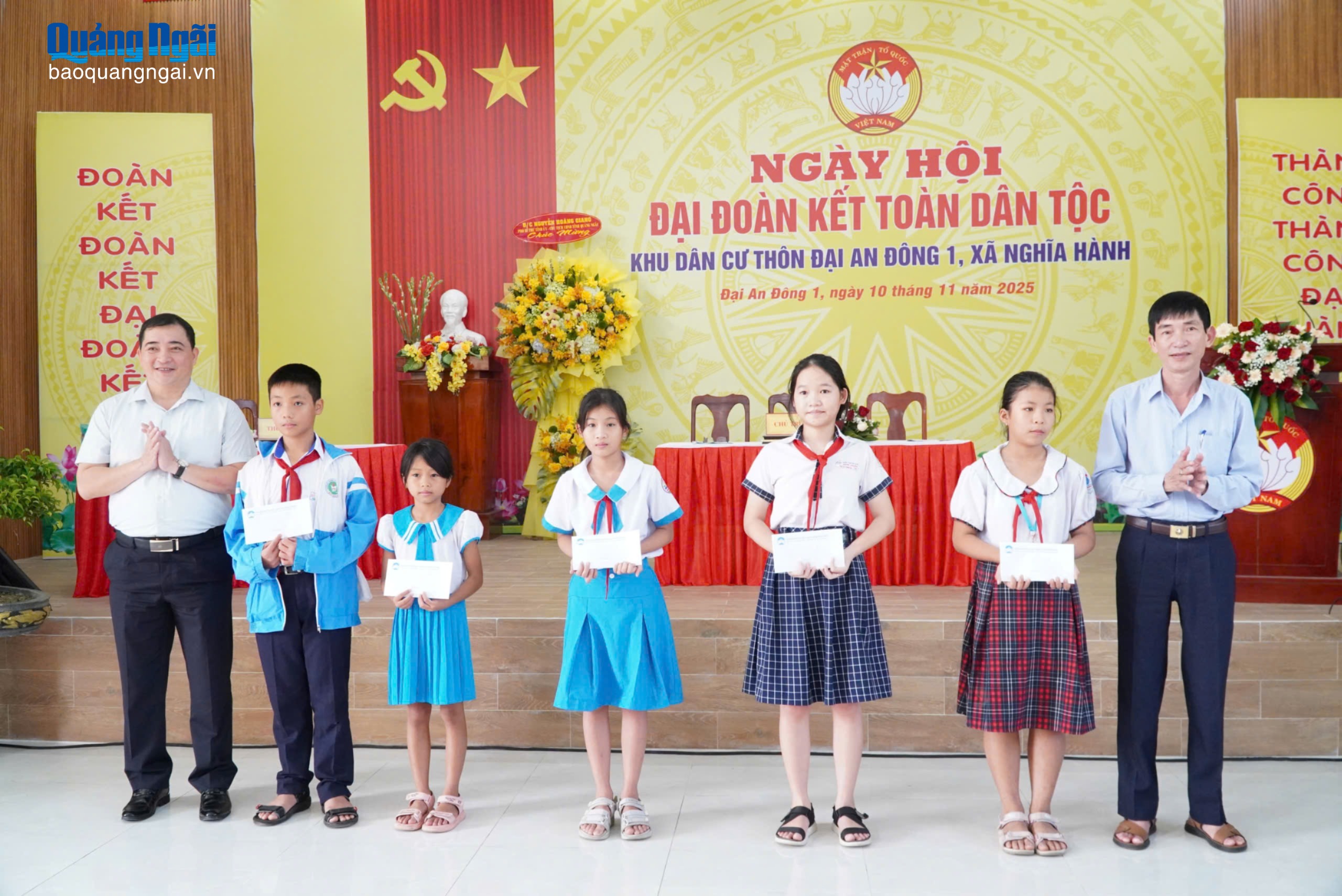Dịp này, Ủy ban MTTQ Việt Nam tỉnh tặng Bằng khen cho Ban Công tác Mặt trận thôn Đại An Đông 1, trao 10 phần quà cho 5 hộ khó khăn và 5 học sinh vượt khó học giỏi; Ủy ban MTTQ xã Nghĩa Hành trao quà cho 5 hộ có hoàn cảnh khó khăn trên địa bàn.